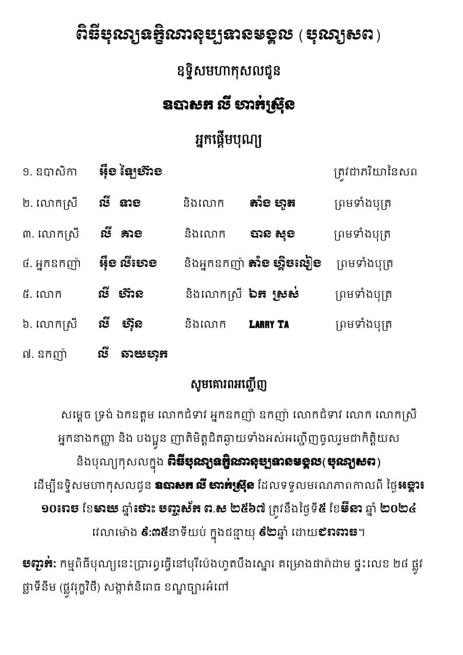 ដំណឹងមរណទុក្ខ! ឧបាសក លី ហាក់ស្រ៊ុន ឪពុកបង្កើតរបស់អ្នកឧកញ៉ា អ៉ីង លីហេង បានទទួលមរណភាព, សពតម្កល់ទុកធ្វើបុណ្យនៅបុរីប៉េងហួតបឹងស្នោ