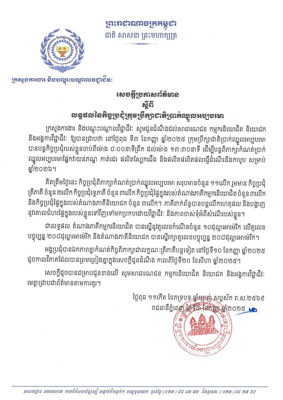 (ភ្នំពេញ)៖ នៅថ្ងៃពុធ ទី៣ ខែកញ្ញា ឆ្នាំ២០២៥ ក្រុមប្រឹក្សាជាតិប្រាក់ឈ្នួលអប្បបរមា បានបន្តកិច្ចប្រជុំរបស់ខ្លួនចាប់ពីម៉ោង ៨:០០នាទីព្រឹក ដល់ម៉ោង ១៣:៣០នាទី ដើម្បីបន្តពិភាក្សាកំណត់ប្រាក់ឈ្នួលអប្បបរមាផ្នែកវាយនភណ្ឌ កាត់ដេរ ផលិតស្បែកជើង និងផលិតផលិតផលធ្វើដំណើរនិងកាបូប សម្រាប់ ឆ្នាំ២០២៦។