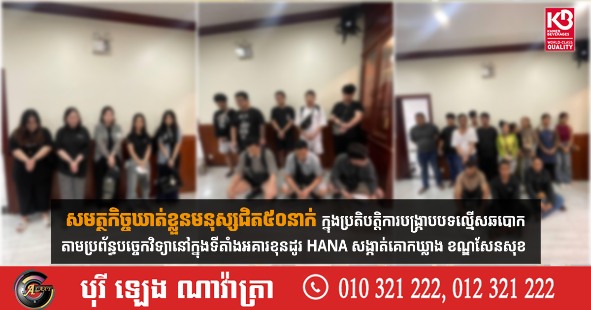 សមត្ថកិច្ចឃាត់ខ្លួនមនុស្សជិត៥០នាក់ ក្នុងប្រតិបត្តិការបង្ក្រាបបទល្មើសឆបោក តាមប្រព័ន្ធបច្ចេកវិទ្យានៅក្នុងទីតាំងអគារខុនដូរ HANA សង្កាត់គោកឃ្លាង ខណ្ឌសែនសុខ