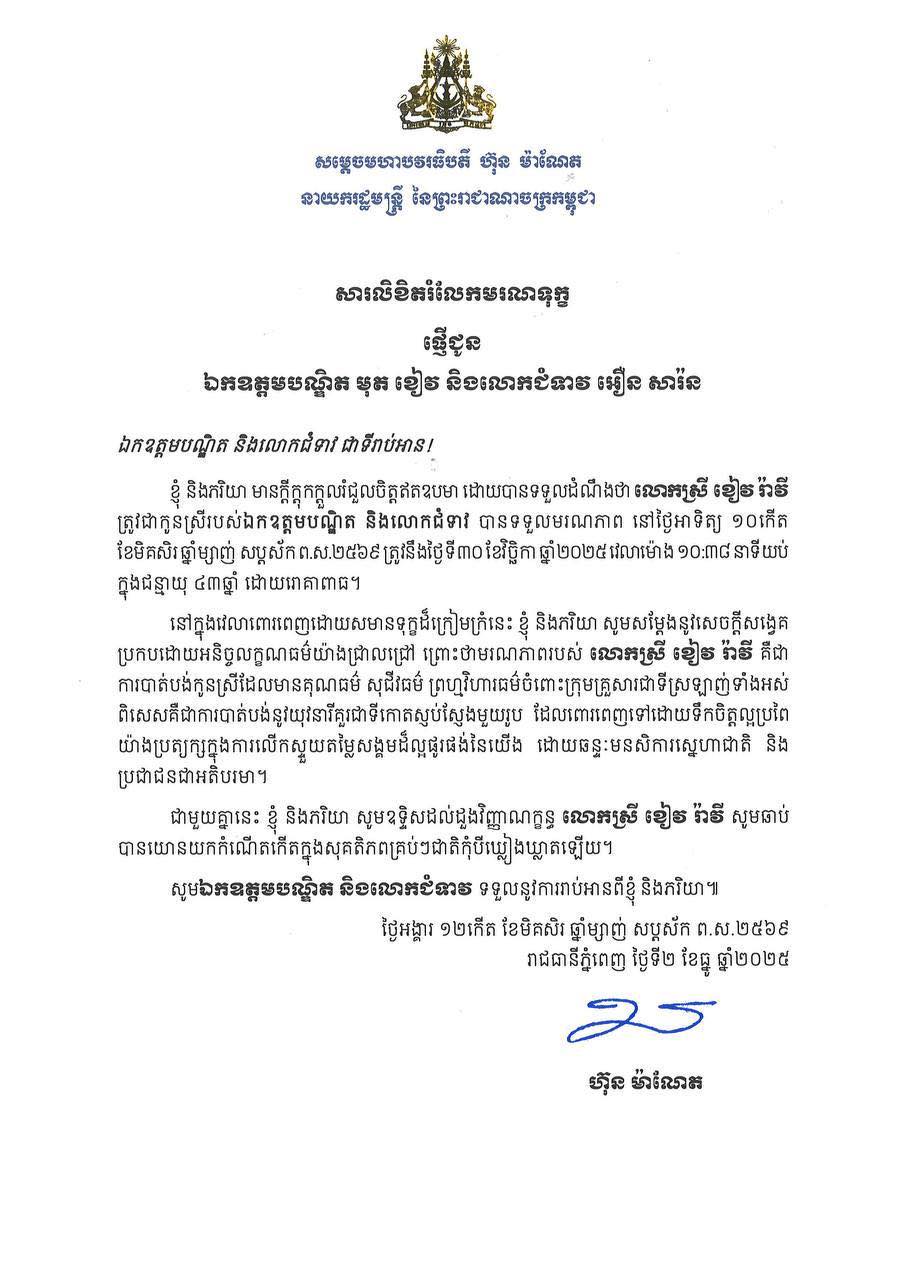 (ភ្នំពេញ)៖ សម្តេចមហាបវរធិបតី ហ៊ុន ម៉ាណែត នាយករដ្ឋមន្រ្តីនៃកម្ពុជា បានផ្ញើសារចូលរួមរំលែកមរណទុក្ខយ៉ាងក្រៀមក្រំបំផុត និងមានការសោកស្ដាយក្រៃលែងជាមួយ ឯកឧត្តមបណ្ឌិត មុត ខៀវ និងលោកជំទាវ អឿន សារ៉ន ព្រមទាំងក្រុមគ្រួសារ ចំពោះមរណភាពរបស់លោកស្រី ខៀវ រ៉ាវី ដែលត្រូវជាកូនស្រីបង្កើត បានទទួលមរណភាព នៅថ្ងៃអាទិត្យទី៣០ ខែវិច្ឆិកា ឆ្នាំ២០២៥ វេលាម៉ោង២២និង៣៨នាទីយប់ ក្នុងជន្មាយុ៤៣ឆ្នាំ ដោយជរាពាធ ។
