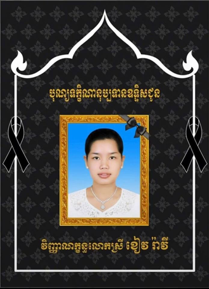 ជាមួយគ្នានេះ ខ្ញុំ និងភរិយា សូមឧទ្ទិសកុសលដល់ដួងវិញ្ញាណក្ខន្ធ លោកស្រី ខៀវ រ៉ាវី សូមឆាប់ បានយោនយកកំណើតកើតក្នុងសុគតិភពគ្រប់ៗជាតិកុំបីឃ្លៀងឃ្លាតឡើយ»៕