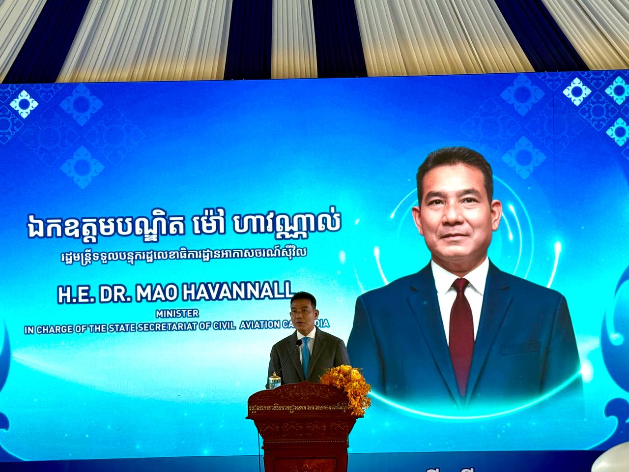 (ភ្នំពេញ)៖ លោកបណ្ឌិត ម៉ៅ ហាវណ្ណាល់ រដ្ឋមន្ត្រីទទួលបន្ទុករដ្ឋលេខាធិការរដ្ឋានអាកាសចរណ៍ស៊ីវិល នៅព្រឹកថ្ងៃទី០៧ ខែធ្នូ ឆ្នាំ២០២៥នេះ បានអញ្ជើញជាអធិបតីភាព ក្នុងទិវាជាតិ អាកាសចរណ៍ស៊ីវិល លើកទី១ ឆ្នាំ២០២៥ ក្រោមប្រធានបទ «អាកាសចរណ៍ស៊ីវិល ដើរតួនាទីយ៉ាងសំខាន់ ក្នុងការចូលរួមជំរុញសេដ្ឋកិច្ច ទេសចរណ៍ សង្គមនិងវប្បធម៌ ឱ្យមានការរីកចម្រើនប្រកប ដោយចីរភាពនៅព្រះរាជាណាចក្រកម្ពុជា»។