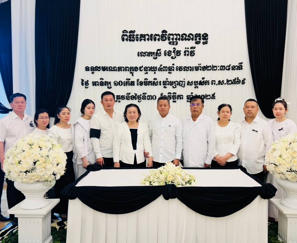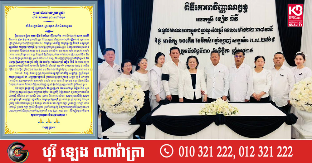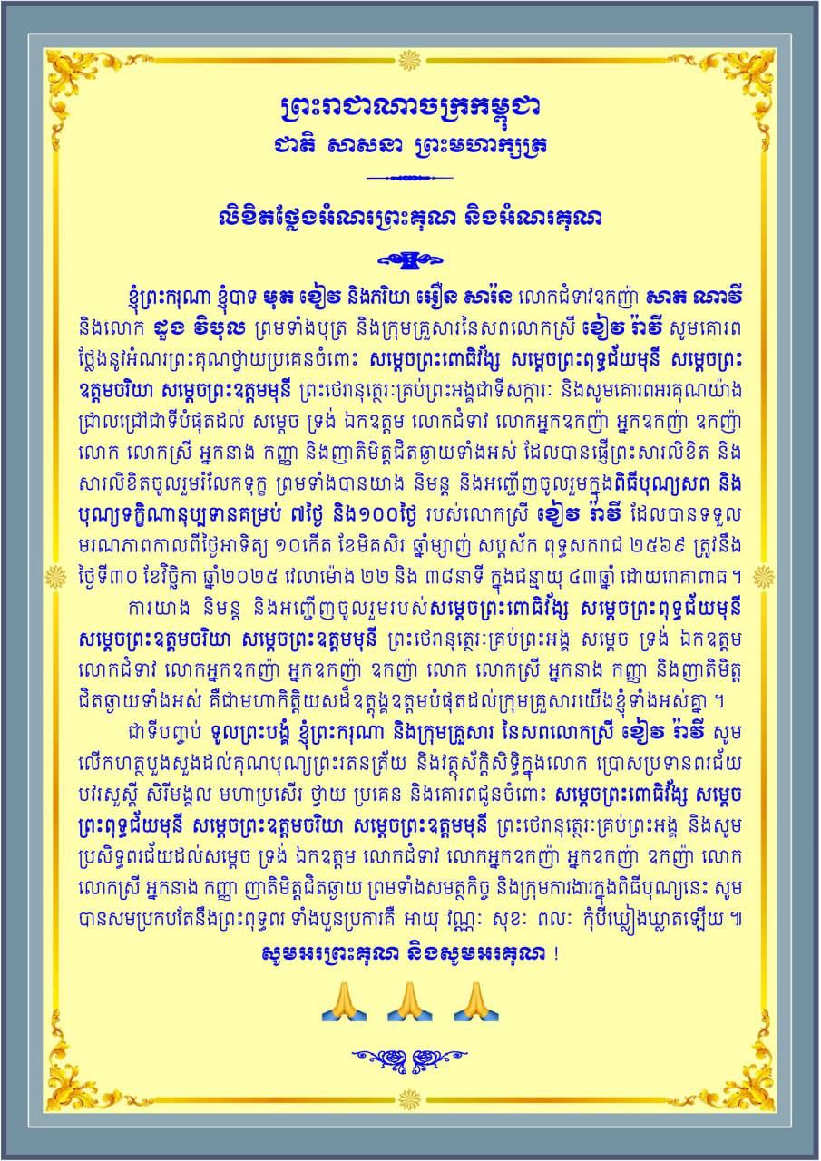 (ភ្នំពេញ)៖ ឯកឧត្តមបណ្ឌិត មុត ខៀវ និងលោកជំទាវ អឿន សារ៉ន លោកជំទាវឧកញ៉ា សាត ណាវី និងលោក ដួង វិបុល ព្រមទាំងបុត្រ និងក្រុមគ្រួសារនៃសពលោកស្រី ខៀវ រ៉ាវី សូមគោរពថ្លែងអំណរព្រះគុណ និងអំណរគុណ ជូនចំពោះថ្នាក់ដឹកនាំ និងញាតិមិត្តជិតឆ្ងាយទាំងអស់ ដែលបានផ្ញើព្រះសារលិខិត និងសារលិខិតចូលរួមរំលែកទុក្ខ មរណភាពកូនស្រីបង្កើតលោកស្រី ខៀវ រ៉ាវី ដែលបានទទួល មរណភាពកាលពីថ្ងៃអាទិត្យ ១០កើត ខែមិគសិរ ឆ្នាំម្សាញ់ សប្តស័ក ពុទ្ធសករាជ ២៥៦៩ ត្រូវនឹង ថ្ងៃទី៣០ ខែវិច្ឆិកា ឆ្នាំ២០២៥ វេលាម៉ោង ២២និង ៣៨នាទី ក្នុងជន្មាយុ ៤៣ឆ្នាំ ដោយរោគាពាធ។