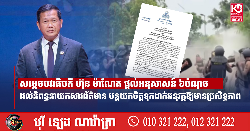 អនុសាសន៍សំខាន់ៗទាំង ៦ចំណុច របស់សម្តេចមហាបវរធិបតី ហ៊ុន ម៉ាណែត ផ្ញើជូនវេទិកានិពន្ធនាយកសារព័ត៌មានកម្ពុជាលើកទី២២ សម្រាប់លោក លោកស្រី និពន្ធនាយកសារព័ត៌មាន បន្តយកចិត្តទុកដាក់អនុវត្តមានដូចជា៖