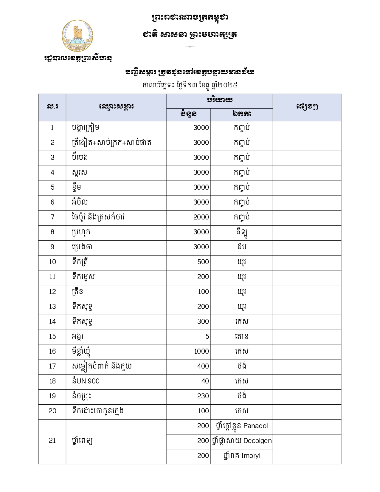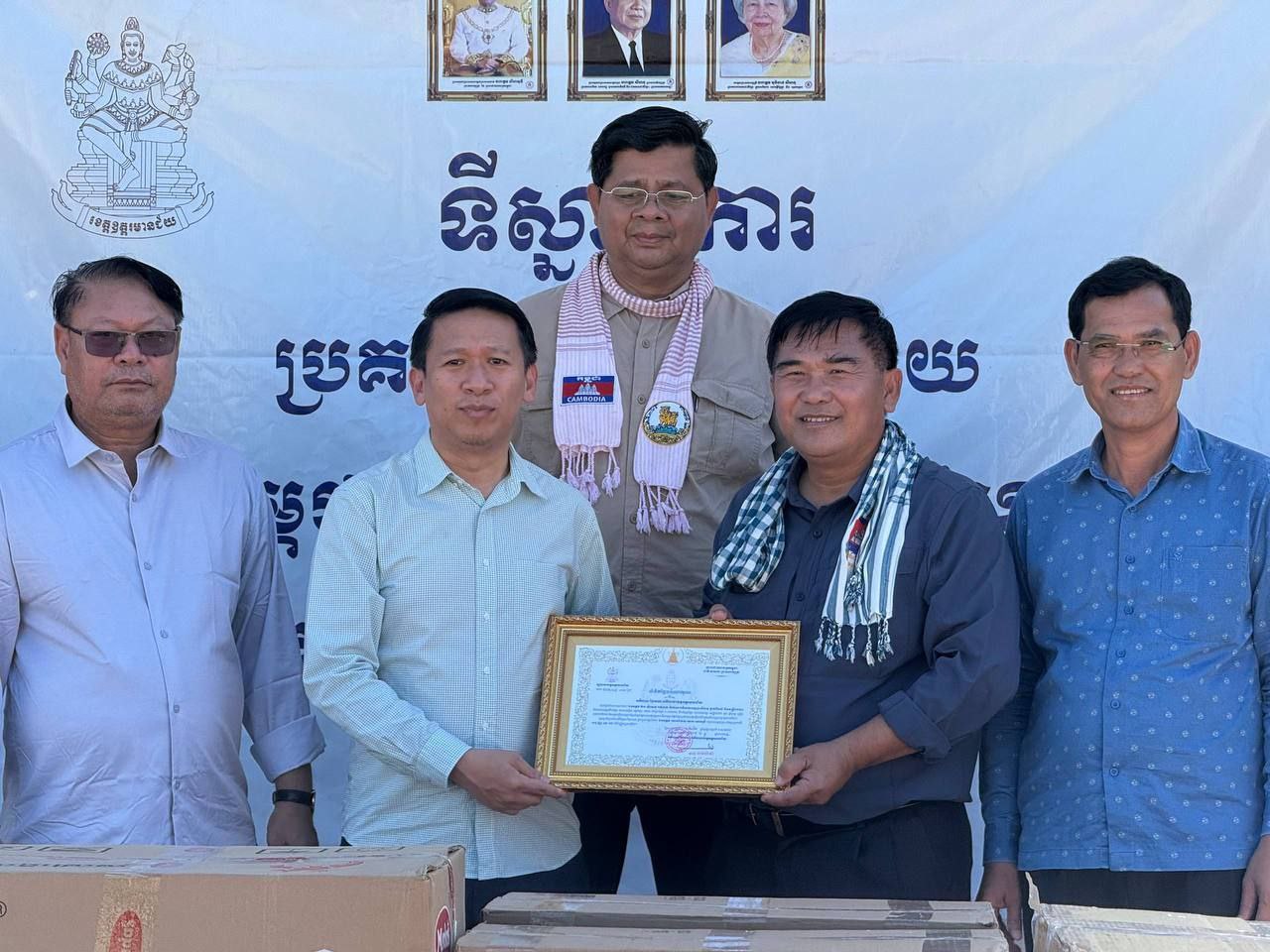 (ព្រះសីហនុ)៖ លោក មីន កុម្ភៈ អភិបាលរងខេត្ត តំណាងលោក ម៉ាង ស៊ីណេត អភិបាលខេត្តព្រះសីហនុ នៅថ្ងៃទី១៥ ខែធ្នូ ឆ្នាំ២០២៥ បានដឹកនាំក្រុមការងារ នាំយកអំណោយ ជាស្បៀងអាហារ គ្រឿងឧបភោគបរិភោគ ថ្នាំសង្កូវ និងសម្ភារប្រើប្រាស់ផ្សេងៗទៀត ដែលបានមកពីការចូលរួមបរិច្ចាគរបស់បងប្អូនប្រជាពលរដ្ឋនៅខេត្តព្រះសីហនុ ជូនដល់វីរកងទ័ពខ្មែរនៅសមរភូមិមុខដែលកំពុងការពារបូរណភាពដែនដីខ្មែរ និងប្រជាពលរដ្ឋភៀសសឹកប្រគល់ជូនដល់បងប្អូនវីរៈកងទ័ព ដែលឈរជើងនៅទិសឧត្តរមានជ័យ។