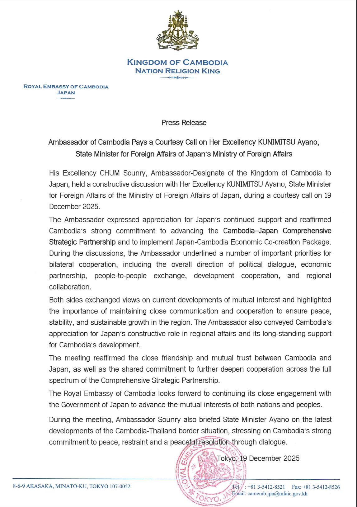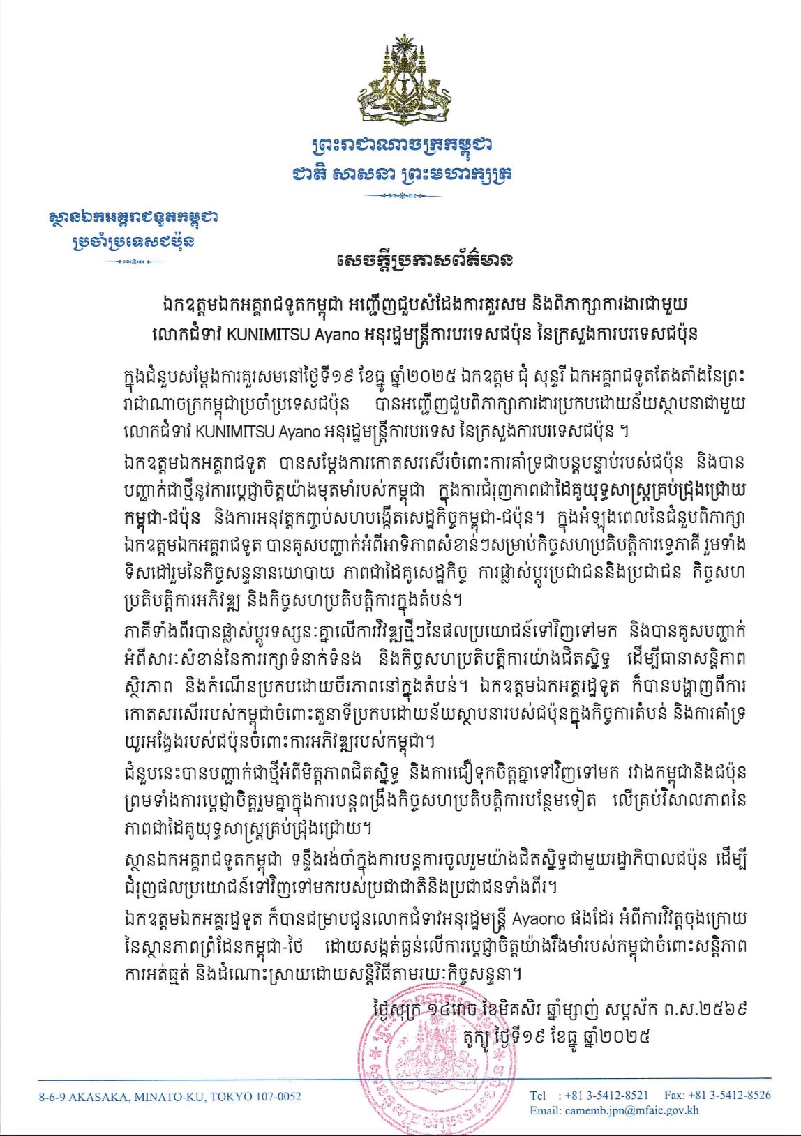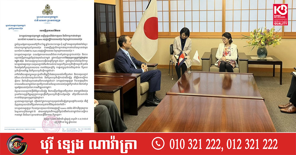 ឯកអគ្គរាជទូតកម្ពុជា ប្រាប់មន្រ្តីជាន់ខ្ពស់ការបរទេសជប៉ុន អំពីការវិវត្តចុងក្រោយ នៃស្ថានភាពព្រំដែនកម្ពុជា-ថៃ ដោយសង្កត់ធ្ងន់លើការប្តេជ្ញាចិត្តយ៉ាងរឹងមាំរបស់កម្ពុជា ចំពោះសន្តិភាព