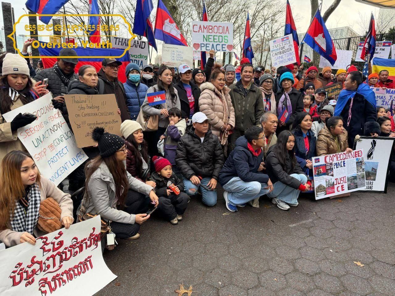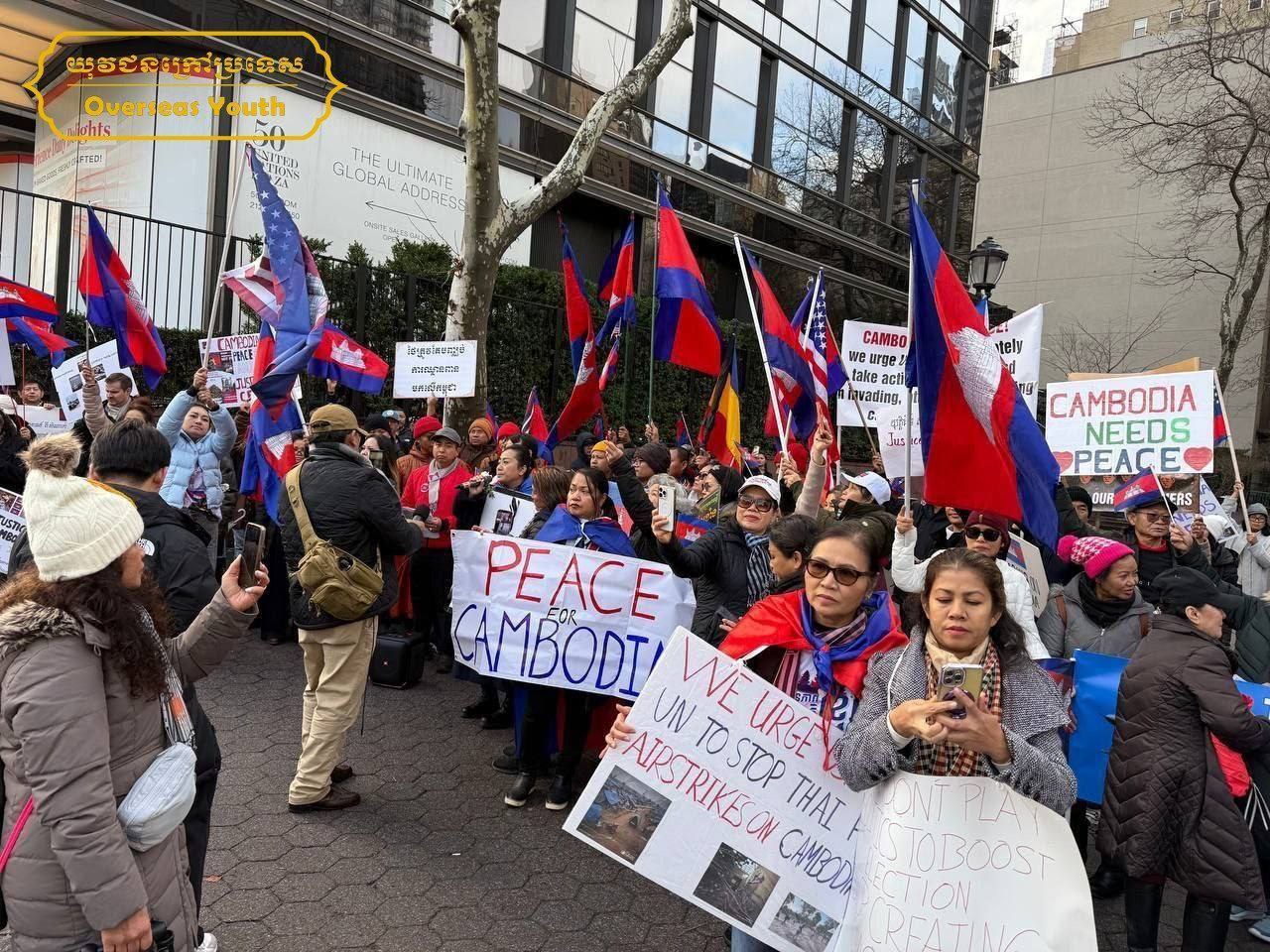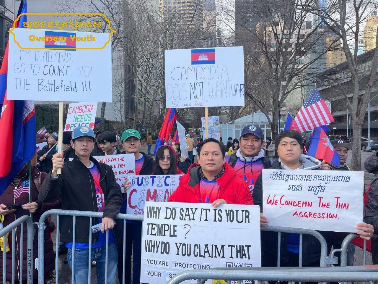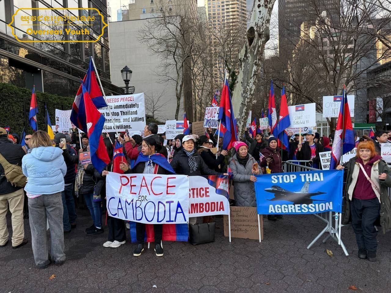 (អាមេរិក)៖ ប្រជាពលរដ្ឋខ្មែរ-អាមេរិកកាំង មកពី រដ្ឋម៉ាសាឈូសេត, រដ្ឋផេនស៊ីលវ៉េនញ៉ា, រដ្ឋវើជីនៀ, រដ្ឋធានីវ៉ាស៊ីងតោនឌី.ស៊ី, បុរីញូវយ៉ក និងរដ្ឋតិចសាសយ៉ាងច្រើនកុះករ នៅថ្ងៃទី១៩ ខែធ្នូ ឆ្នាំ២០២៥ បានជួបជុំជាគ្នានៅមុខទីស្នាក់ការកណ្តាលអង្គការសហប្រជាជាតិ (U.N Headquarter) ធ្វើការសម្តែងមតិ និងបានដាក់ញត្តិប្រឆាំង ប្រទេសថៃដែលបាន និងកំពុងឈ្លានពាន ដោយប្រើកម្លាំងយោធាមកលើអធិបតេយ្យ និងបូរណភាពទឹកដីកម្ពុជា ដោយរំលោភទាំងស្រុងលើច្បាប់អន្តរជាតិ រដ្ឋធម្មនុញ្ញអង្គការសហប្រជាជាតិ និងកិច្ចព្រមព្រៀងសន្តិភាពទីក្រុងកូឡាឡាំពួរ៕