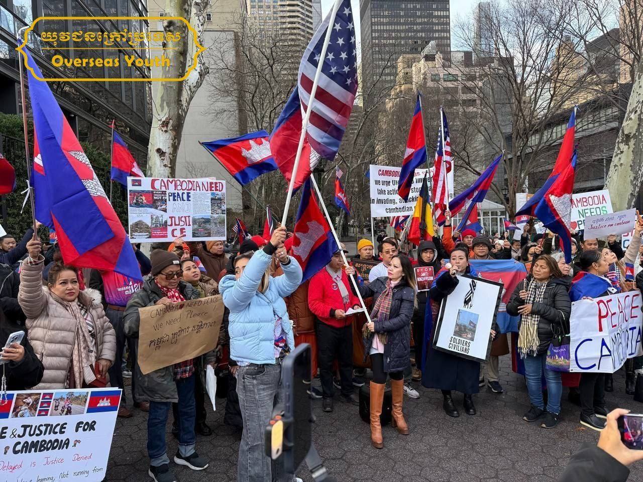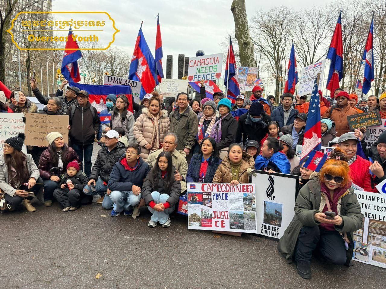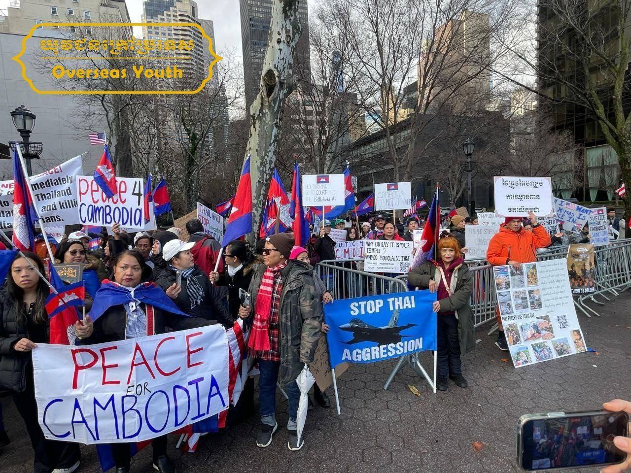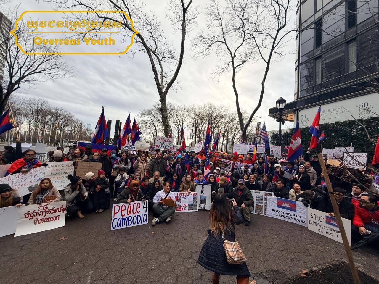 (អាមេរិក)៖ ប្រជាពលរដ្ឋខ្មែរ-អាមេរិកកាំង មកពី រដ្ឋម៉ាសាឈូសេត, រដ្ឋផេនស៊ីលវ៉េនញ៉ា, រដ្ឋវើជីនៀ, រដ្ឋធានីវ៉ាស៊ីងតោនឌី.ស៊ី, បុរីញូវយ៉ក និងរដ្ឋតិចសាសយ៉ាងច្រើនកុះករ នៅថ្ងៃទី១៩ ខែធ្នូ ឆ្នាំ២០២៥ បានជួបជុំជាគ្នានៅមុខទីស្នាក់ការកណ្តាលអង្គការសហប្រជាជាតិ (U.N Headquarter) ធ្វើការសម្តែងមតិ និងបានដាក់ញត្តិប្រឆាំង ប្រទេសថៃដែលបាន និងកំពុងឈ្លានពាន ដោយប្រើកម្លាំងយោធាមកលើអធិបតេយ្យ និងបូរណភាពទឹកដីកម្ពុជា ដោយរំលោភទាំងស្រុងលើច្បាប់អន្តរជាតិ រដ្ឋធម្មនុញ្ញអង្គការសហប្រជាជាតិ និងកិច្ចព្រមព្រៀងសន្តិភាពទីក្រុងកូឡាឡាំពួរ៕
