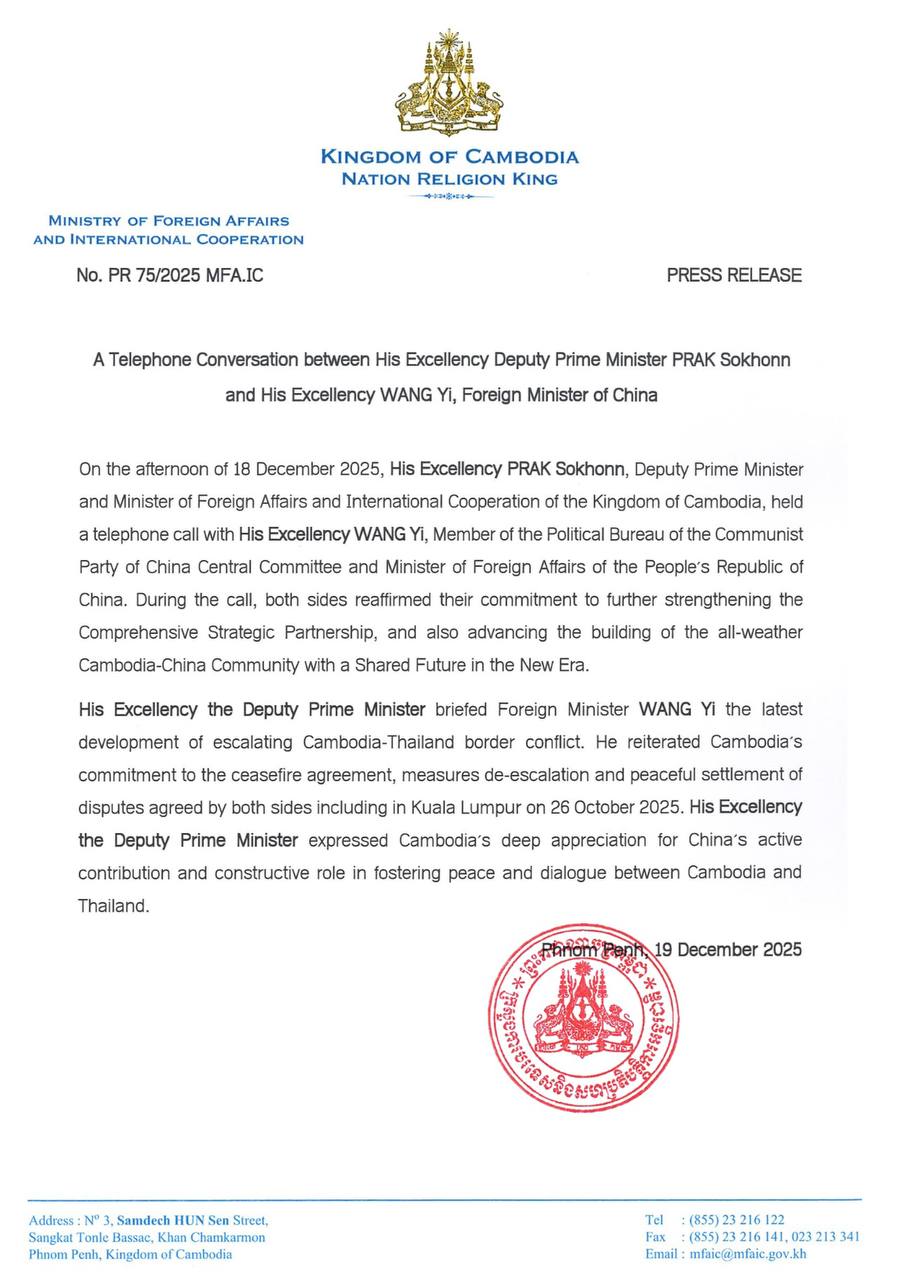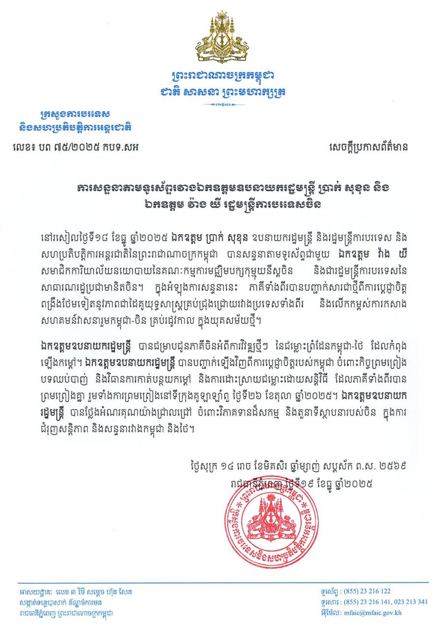 (ភ្នំពេញ)៖ លោកឧបនាយករដ្ឋមន្ត្រី ប្រាក់ សុខុន និងរដ្ឋមន្ត្រីការបរទេស និងសហប្រតិបត្តិការអន្តរជាតិកម្ពុជា កាលពីថ្ងៃទី១៨ ខែធ្នូ ឆ្នាំ២០២៥ បានសន្ទនាតាមទូរស័ព្ទជាមួយ លោក វ៉ាង យី រដ្ឋមន្ត្រីការបរទេសនៃ សមាជិកការិយាល័យនយោបាយនៃគណៈកម្មការមជ្ឈិមបក្សកុម្មុយនីស្តចិន សាធារណរដ្ឋប្រជាមានិតចិន។