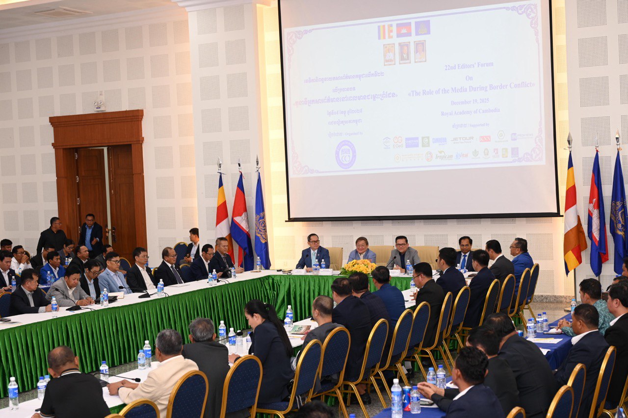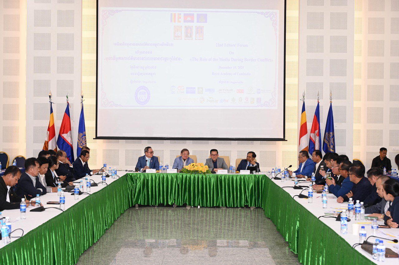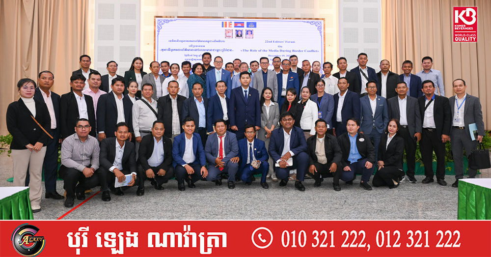 (ភ្នំពេញ)៖ វេទិកានិពន្ធនាយកសារព័ត៌មានកម្ពុជាលើកទី២២ ដែលជាវេទិកាប្រចាំឆ្នាំដ៏ធំបំផុតរបស់ក្លិបអ្នកកាសែតកម្ពុជា (ក.អ.ក) នៅថ្ងៃទី១៩ ខែធ្នូ ឆ្នាំ២០២៥នេះ ក.អ.ក បានលើយកប្រធានបទ «តួនាទីអ្នកសារព័ត៌មាននៅពេលមានជម្លោះព្រំដែន» ដើម្បីផ្តល់ឱកាសដល់នាយកគ្រប់គ្រង និពន្ធនាយក និពន្ធនាយករង ឬអ្នកដឹកនាំស្ថាប័នសារព័ត៌មានទាំងកាសែត វិទ្យុ ទូរទស្សន៍ និងអ្នកសារព័ត៌មានចូលរួមសរុបជាង២០០នាក់ មកពី១០៩ស្ថាប័ន បានជជែកពិភាក្សាលើប្រធានបទខាងលើយ៉ាងផុសផុលហើយបានសម្រេចអនុម័តចេញនូវសេចក្តីថ្លែងការណ៍រួមមួយដែលមានខ្លឹមសារ១៣ចំណុច ដូចខាងក្រោម៖