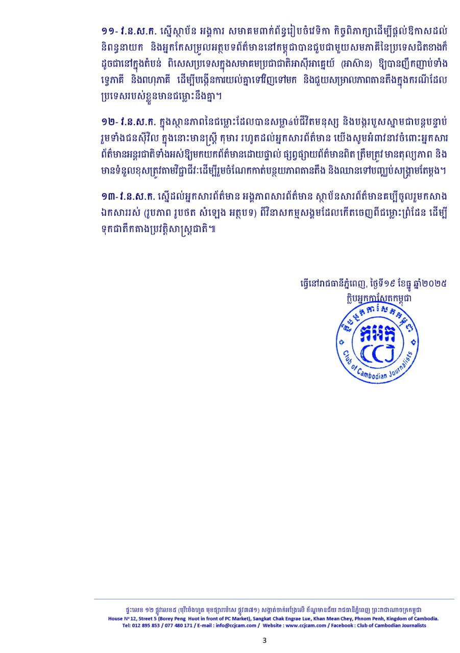 ទី១២៖ វ.ន.ស.ក. ក្នុងស្ថានភាពនៃជម្លោះដែលបានសម្លាប់ជីវិតមនុស្ស និងបង្ករបួសស្នាមជាបន្តបន្ទាប់ រួមទាំងជនស៊ីវិល ក្នុងនោះមានស្ត្រី កុមារ រហូតដល់អ្នកសារព័ត៌មាន យើងសូមអំពាវនាវចំពោះអ្នកសារ ព័ត៌មានអន្តរជាតិទាំងអស់ឱ្យមកយកព័ត៌មានដោយផ្ទាល់ ផ្សព្វផ្សាយព័ត៌មានពិត ត្រឹមត្រូវ មានតុល្យភាព និង មានទំនួលខុសត្រូវតាមវិជ្ជាជីវៈដើម្បីរួមចំណែកកាត់បន្ថយភាពតានតឹង និងឈានទៅបញ្ឈប់សង្គ្រាមតែម្តង។