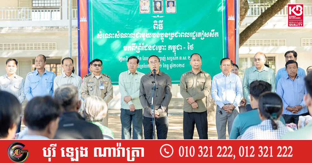 (ព្រៃវែង)៖ លោក សួន សុម៉ាលីន អភិបាលខេត្តព្រៃវែង នៅព្រឹកថ្ងៃទី២១ ខែធ្នូ ឆ្នាំ២០២៥ បានអញ្ជើញជួបសំណេះសំណាលសួរសុខទុក្ខ និងចែកអំណោយលោកអភិសន្តិបណ្ឌិត ស សុខា ឧបនាយករដ្ឋមន្ត្រី រដ្ឋមន្ត្រីក្រសួងមហាផ្ទៃ និងជាប្រធានក្រុមការងាររាជរដ្ឋាភិបាលចុះមូលដ្ឋានខេត្តព្រៃវែង និង លោកស្រីកែ សួនសុភី សសុខា ជូនបងប្អូនប្រជាពលរដ្ឋជនភៀសសឹក ដែលរត់គេចពីការឈ្លានពានរបស់យោធាថៃ ចំនួន ១០៧គ្រួសារ នៅស្រុកកំពង់ត្របែក ខេត្តព្រៃវែង។