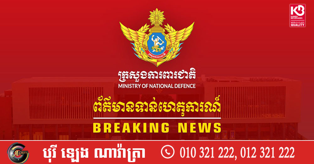 (ភ្នំពេញ)៖ ក្រសួងការពារជាតិ សូមជម្រាបជូននូវស្ថានការណ៍នៅតាមបន្ទាត់ព្រំដែនកម្ពុជា-ថៃ អំពីករណីយោធាថៃនៅតែបន្តធ្វើសកម្មភាពបាញ់ប្រហារចូលទីតាំងប្រជាជនស៊ីវិលកម្ពុជា និងហេដ្ឋារចនាសម្ព័ន្ធស៊ីវិល នៅយោធភូមិភាគទី៥ ក្នុងភូមិសាស្រ្ត ឃុំនិមិត្ត ស្រុកអូជ្រៅ ខេត្តបន្ទាយមានជ័យ នាថ្ងៃទី២១ ខែធ្នូ ឆ្នាំ២០២៥៖