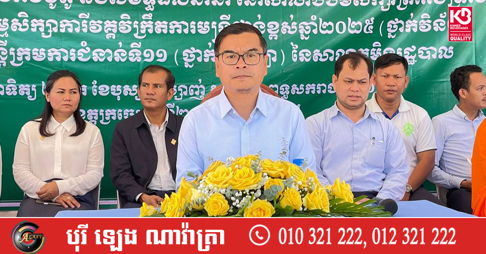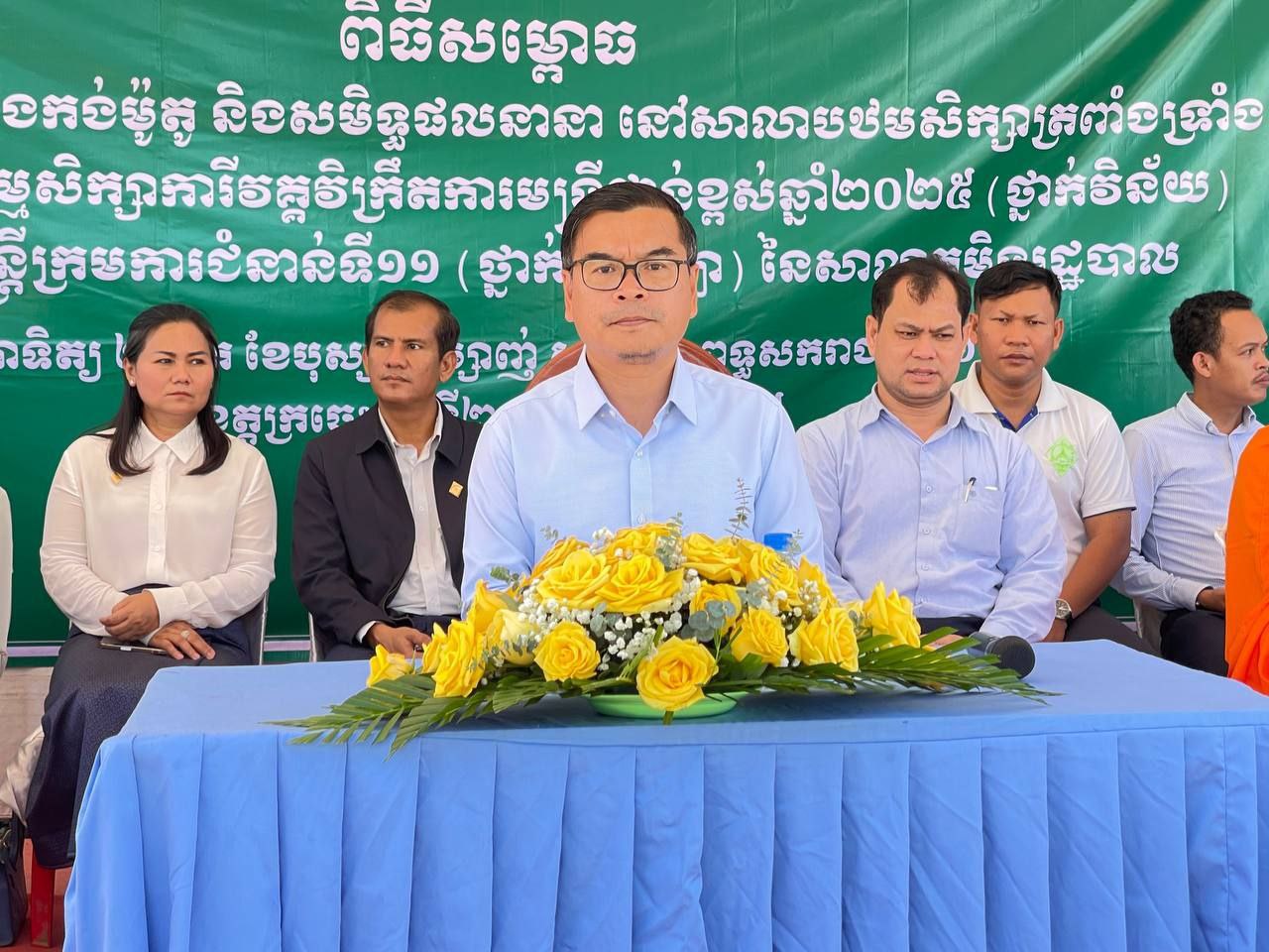 (ក្រចេះ)៖ លោក យក់ ប៊ុនណា រដ្ឋលេខាធិការប្រចាំការក្រសួងមុខងារសាធារណៈ និងជានាយកសាលាភូមិន្ទរដ្ឋបាល តំណាងលោក ហ៊ុន ម៉ានី ឧបនាយករដ្ឋមន្រ្តី រដ្ឋមន្រ្តីក្រសួងមុខងារសាធារណៈ បានអញ្ជេីញចូលរួមសម្ពោធសមិទ្ធផលនានា នៅសាលាបឋមសិក្សាត្រពាំងត្រាំង ដែលស្ថិតក្នុងឃុំចង្ក្រង់ ស្រុកចិត្របុរី ខេត្តក្រចេះ នាព្រឹកថ្ងៃទី២១ ខែធ្នូ ឆ្នាំ២០២៥ ។