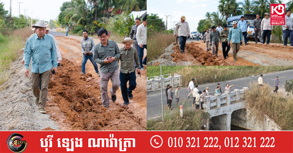 (កំពត-តាកែវ)៖ នារសៀលថ្ងៃទី២១ ខែធ្នូ ឆ្នាំ២០២៥ លោកឆាយ ឫទ្ធិសែន រដ្ឋមន្រ្ដីក្រសួងអភិវឌ្ឍន៍ជនបទ រួមដំណើរដោយ ឯកឧត្តមថ្នាក់ដឹកនាំនៃក្រសួងអភិវឌ្ឍន៍ជនបទ បានដឹកនាំមន្ដ្រីបច្ចេកទេសក្រសួង និងមន្ទីរអភិវឌ្ឍន៍ជនបទខេត្ត អញ្ជើញទៅពិនិត្យគុណភាពផ្លូវជនបទចំនួន ៦ខ្សែ នៅក្នុងខេត្តកំពត និងខេត្តតាកែវ។