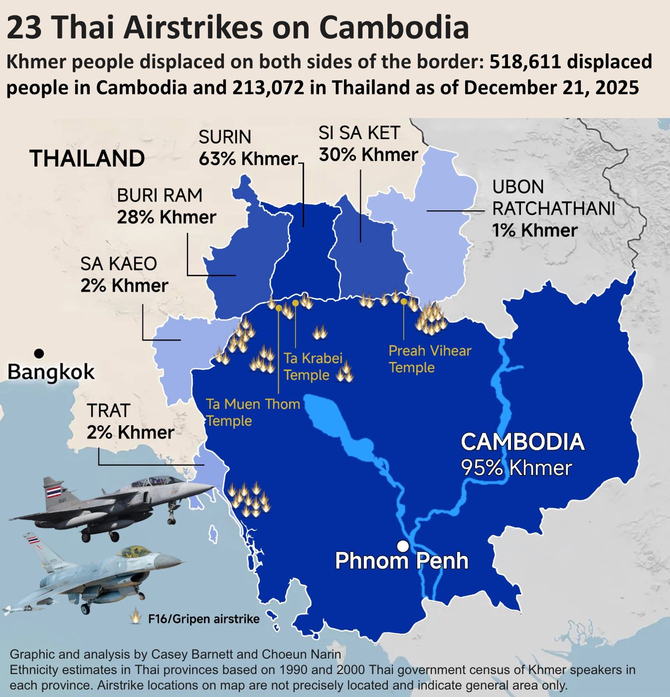 The Thai airstrikes are unanswered by Cambodia. Cambodia does not have its own fighter aircraft or any surface-to-air defenses. Cambodia has no choice but to absorb the bombings, which have resulted in internal displacement of 518,611 Cambodian families, children, and elderly who are now surviving in make-shift tents in camps.(1) Thailand also reports 213,072 people displaced out of precaution from Cambodian artillery fire.(2) It is the ethnic Khmer people on both sides of the border that are suffering. While it is well known that Cambodia is approximately 95% Khmer, the Thai provinces along the border are also populated by Khmer people, such as Surin province which is estimated to be at least 63% Khmer despite widespread language assimilation.(3)