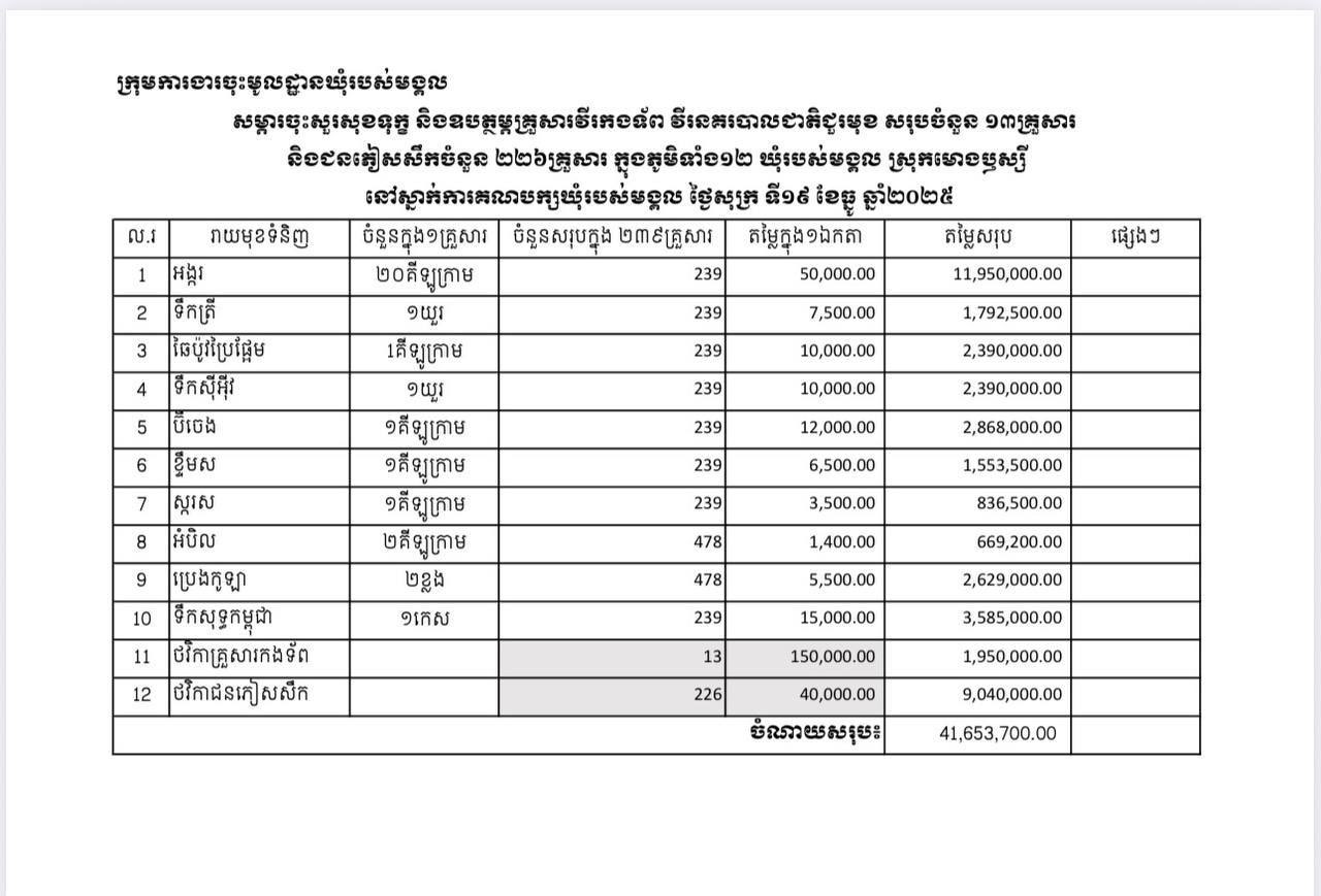 ក្នុងឱកាសនោះ លោកបណ្ឌិត ជីវ កេង បាននាំយកអំណោយប្រគល់ ជូនក្រុមគ្រួសារវីរៈកងទ័ព និងគ្រួសារជនភៀសសឹករួមមាន៖ អង្ករចំនួន២០គីឡូក្រាម ទឹកស៊ីអ៊ីវ ១យួរ ទឹកត្រី ១យួរ គ្រឿងឧបភោគបរិភោគមួយចំនួនផ្សេងទៀត និងថវិកាចំនួន ១៥ម៉ឺនរៀល សម្រាប់គ្រួសារវីរៈកងទ័ពជួរមុខ និងសម្រាប់គ្រួសារជនភៀសសឹក ថវិកាចំនួន៤ម៉ឺនរៀល៕