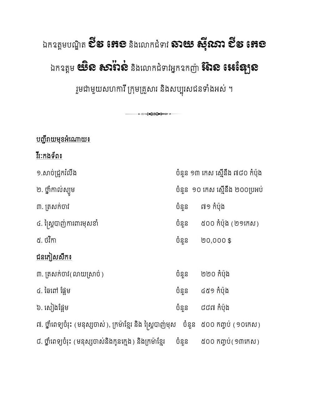 អំណោយសម្រាប់វីរៈកងទ័ព រួមមាន៖ សាច់ជ្រូករំលីង ចំនួន១៣ កេស ស្មើនឹង៧៨០កំប៉ុង, ថ្នាំកាល់ស្យូម ចំនួន១០កេស ស្មើនឹង២០០ប្រអប់, ត្រសក់ចាវ ចំនួន៧១កំប៉ុង, ស្ពៃបាញ់ការពារមុសខាំ ចំនួន៥០០ កំប៉ុង (២១កេស) និងថវិកា ចំនួន២០,០០០ ដុល្លារ។
