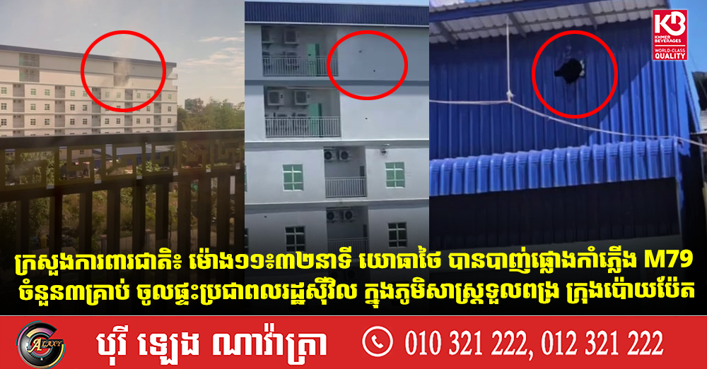 ក្រសួងការពារជាតិ៖ ម៉ោង១១៖៣២នាទី យោធាថៃ បានបាញ់ផ្លោងកាំភ្លើង M79 ចំនួន៣គ្រាប់ ចូលផ្ទះប្រជាពលរដ្ឋស៊ីវិល ក្នុងភូមិសាស្ត្រទួលពង្រ ក្រុងប៉ោយប៉ែត (Video inside)