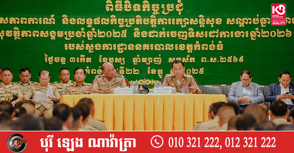 (កំពង់ធំ)៖ ដោយមានការអនុញ្ញាតពីនាយឧត្តមសេនីយ៍ ស ថេត អគ្គស្នងការនគរបាលជាតិ នាព្រឹកថ្ងៃទី២២ ខែធ្នូ ឆ្នាំ២០២៥នេះ លោកឧត្តមសេនីយ៍ឯក លន់ សុផាត អគ្គស្នងការរង នាយឧត្តមសេនីយ៍ ស ថេត អគ្គស្នងការនគរបាលជាតិ និងលោក នួន ផារ័ត្ន អភិបាលខេត្តកំពង់ធំ បានអញ្ជើញជាអធិបតីក្នុងពិធីបិទកិច្ចប្រជុំបូកសរុបសភាពការណ៍ និងលទ្ធផលកិច្ចប្រតិបត្តិការ ឆ្នាំ២០២៥ និងដាក់ចេញទិសដៅការងារ ឆ្នាំ២០២៦ របស់ស្នងការដ្ឋាននគរបាលខេត្តកំពង់ធំ។
