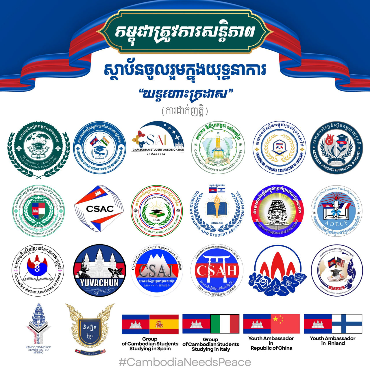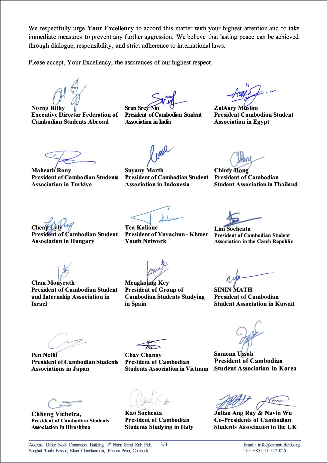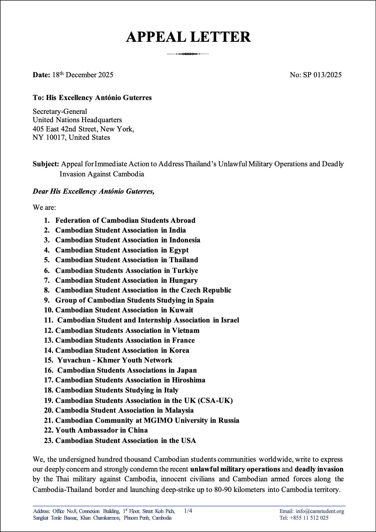 (ភ្នំពេញ)៖ សហព័ន្ធនិស្សិតកម្ពុជានៅបរទេស រួមនឹងសមាគមនិស្សិត សហគមន៍និស្សិត ក្រុមនិស្សិត និងយុវទូតសុឆន្ទៈកម្ពុជាប្រចាំនៅបរទេស សរុប២៤ស្ថាប័ន ដែលប្រចាំនៅ២៤ប្រទេស បានដាក់ញត្តិបន្ទាន់ទៅលោក António Guterres អគ្គលេខាធិការ នៃអង្គការសហប្រជាជាតិ នាថ្ងៃទី២១ ខែធ្នូ ឆ្នាំ២០២៥។