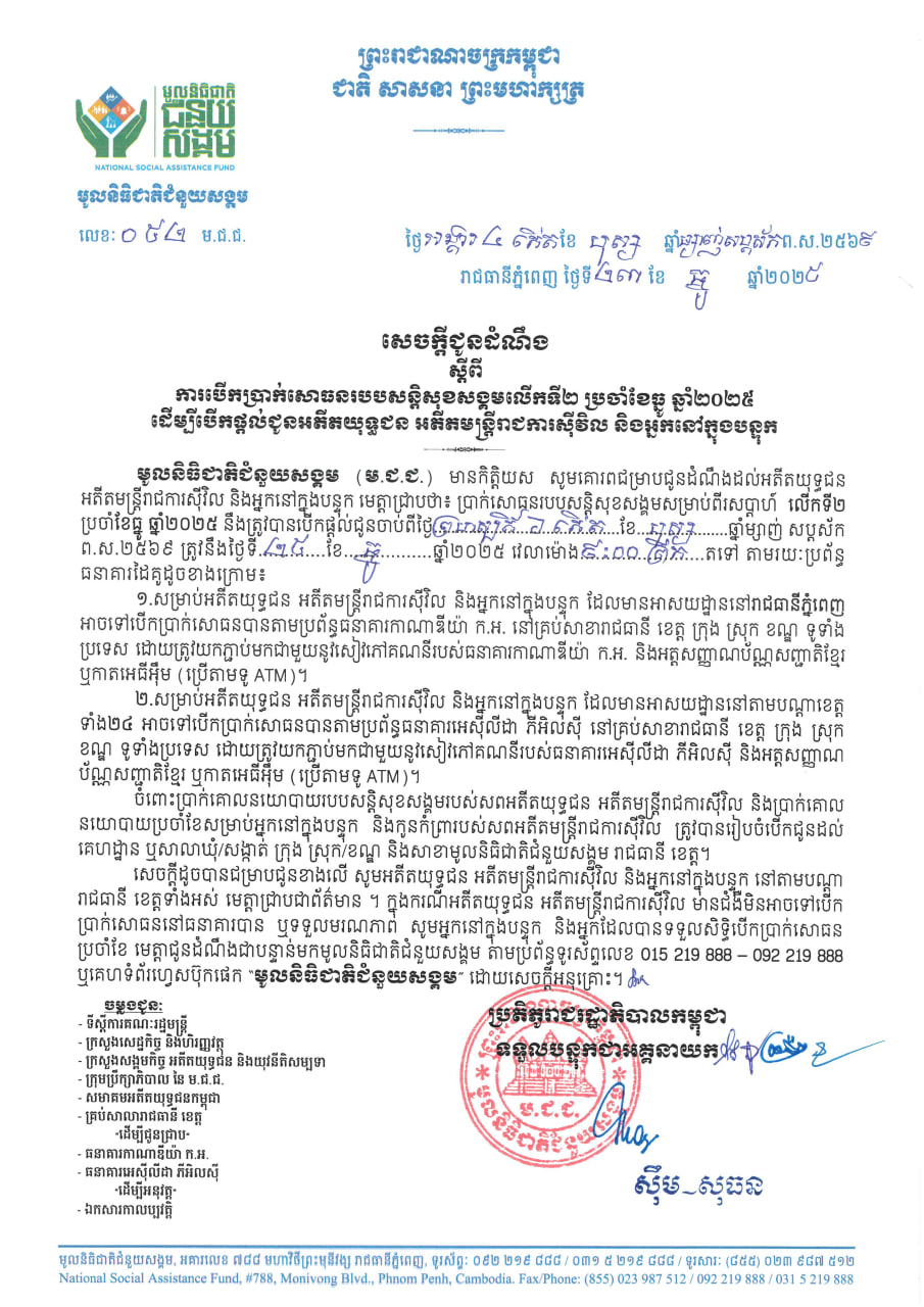 មូលនិធិជាតិជំនួយសង្គម៖ ការបើកប្រាក់សោធនរបបសន្តិសុខសង្គម លើកទី២ ប្រចាំខែធ្នូ ឆ្នាំ២០២៥ ជូនអតីតយុទ្ធជន អតីតមន្ត្រីរាជការស៊ីវិល និងអ្នកនៅក្នុងបន្ទុក ចាប់ពីម៉ោង០៩៖០០នាទីព្រឹកថ្ងៃទី២៥ ខែធ្នូនេះ
