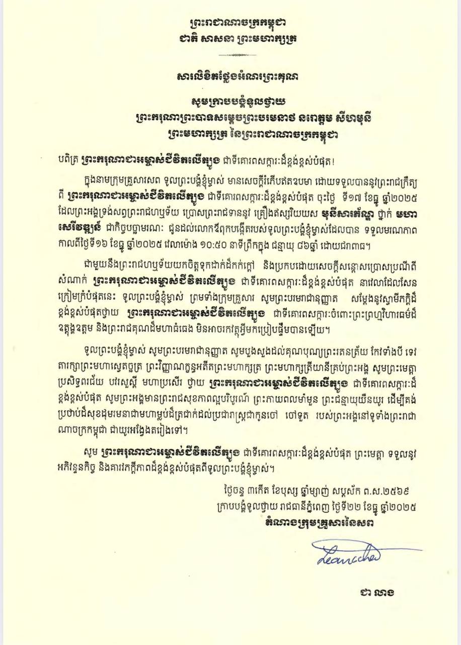 ក្នុងសារលិខិតថ្លែងអំណរព្រះគុណ បានសរសេរថា «ក្នុងនាមក្រុមគ្រួសារសព ទូលព្រះបង្គំខ្ញុំម្ចាស់ មានសេចក្តីរំភើបឥតឧបមា ដោយទទួលបាននូវព្រះរាជក្រឹត្យ ពីព្រះករុណា ជាអម្ចាស់ជីវិតលើត្បូង ជាទីគោរពសក្ការៈដ៏ខ្ពង់ខ្ពស់បំផុត ចុះថ្ងៃទី១៧ ខែធ្នូ ឆ្នាំ២០២៥ ដែលព្រះអង្គទ្រង់សព្វព្រះរាជហឬទ័យ ប្រោសព្រះរាជទាននូវ គ្រឿងឥស្សរិយយស មុនីសារភ័ណ្ឌ ថ្នាក់មហាសេរីវឌ្ឍន៍ ជាកិច្ចបច្ឆាមរណៈ ជូនដល់លោកឪពុកបង្កើត របស់ទូលព្រះបង្គំខ្ញុំម្ចាស់ដែលបាន ទទួលមរណភាព កាលពីថ្ងៃទី១៦ ខែធ្នូ ឆ្នាំ២០២៥ វេលាម៉ោង១០៖៥០នាទីព្រឹក ក្នុងជន្មាយុ ៨៦ឆ្នាំ ដោយជរាពាធ។