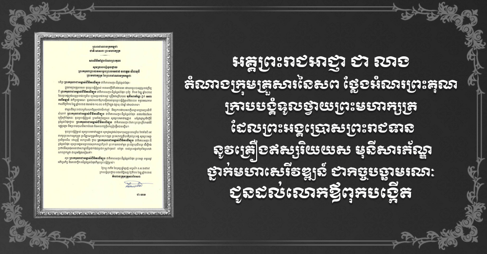 (ភ្នំពេញ)៖ អគ្គព្រះរាជអាជ្ញា ជា លាង តំណាងក្រុមគ្រួសារនៃសព បានចេញសារលិខិតថ្លែងអំណរព្រះគុណ សូមក្រាបបង្គំទូលថ្វាយ ព្រះករុណាព្រះបាទ សម្តេចព្រះបរមនាថ នរោត្តម សីហមុនី ព្រះមហាក្សត្រ នៃព្រះរាជាណាចក្រកម្ពុជា ដែលព្រះអង្គទ្រង់សព្វព្រះរាជហឬទ័យ ប្រោសព្រះរាជទាន នូវគ្រឿងឥស្សរិយយស មុនីសារភ័ណ្ឌ ថ្នាក់មហាសេរីវឌ្ឍន៍ ជាកិច្ចបច្ឆាមរណៈ ជូនដល់លោកឪពុកបង្កើត។