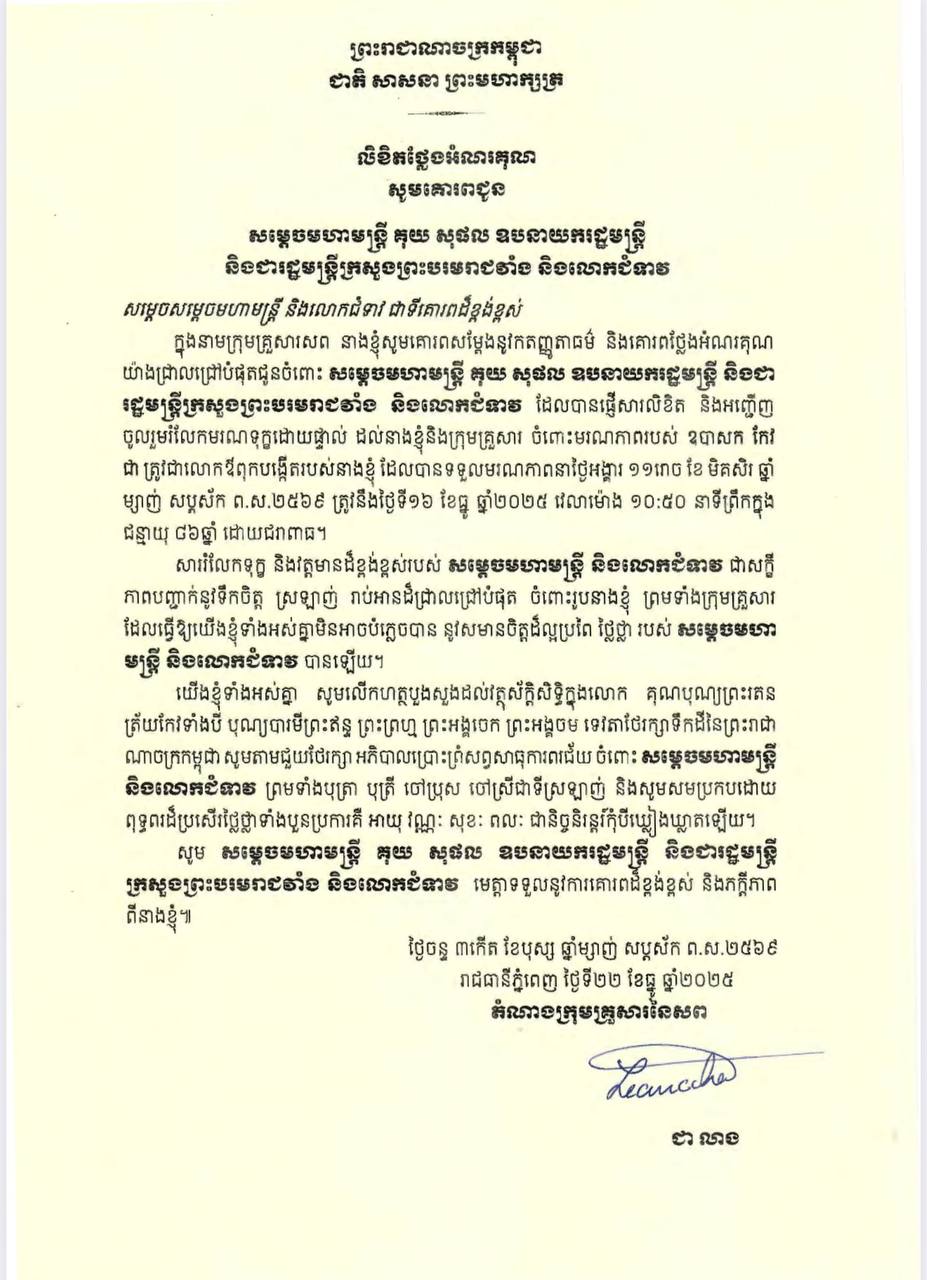 ក្នុងសារលិខិតថ្លែងអំណរគុណ បានសរសេរថា «ក្នុងនាមក្រុមគ្រួសារសព នាងខ្ញុំសូមគោរពសម្តែងនូវកតញ្ញូតាធម៌ និងគោរពថ្លែងអំណរគុណយ៉ាងជ្រាលជ្រៅបំផុតជូនចំពោះ សម្ដេចមហាមន្ដ្រី គុយ សុផល ឧបនាយករដ្ឋមន្ដ្រី និងជារដ្ឋមន្ដ្រីក្រសួងព្រះបរមរាជរាំង និងលោកជំទាវ ដែលបានផ្ញើសារលិខិត និងបានអញ្ជើញចូលរួមរំលែកមរណទុក្ខដោយផ្ទាល់ ដល់នាងខ្ញុំ និងក្រុមគ្រួសារ ចំពោះមរណភាពរបស់ ឧបាសក កែវ ជា ត្រូវជាលោកឪពុក បង្កើតរបស់នាងខ្ញុំ ដែលបានទទួលមរណភាពនាថ្ងៃអង្គារ ១១រោច ខែ មិគសិរ ឆ្នាំម្សាញ់ សប្តស័ក ព.ស.២៥៦៩ ត្រូវនឹងថ្ងៃទី១៦ ខែធ្នូ ឆ្នាំ២០២៥ វេលាម៉ោង១០៖៥០នាទីព្រឹក ក្នុងជន្មាយុ ៨៦ឆ្នាំ ដោយជរាពាធ។