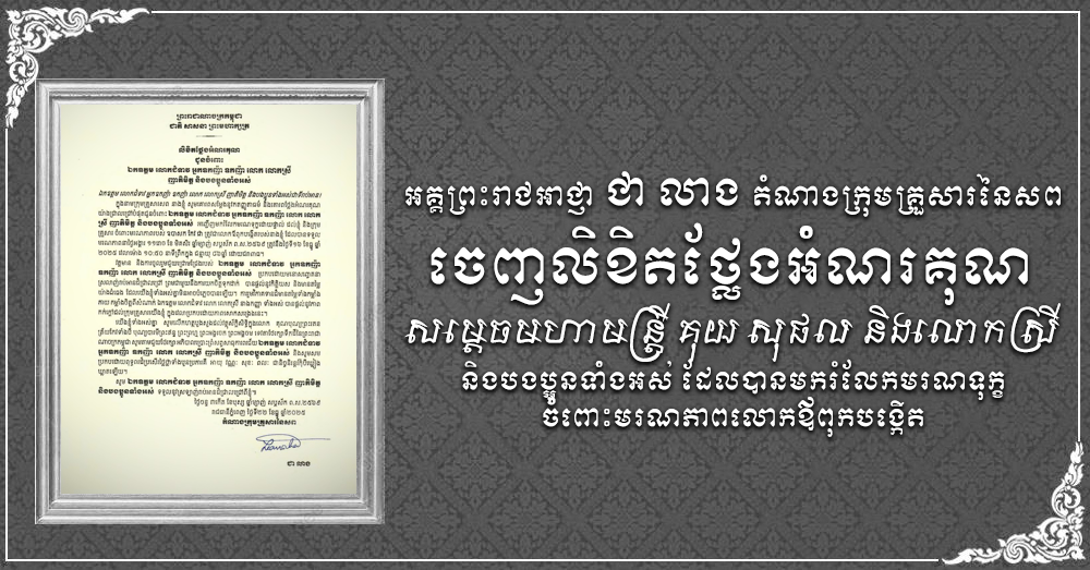 សាររំលែកទុក្ខ និងវត្តមានដ៏ខ្ពង់ខ្ពស់របស់ សម្ដេចមហាមន្ដ្រី និងលោកស្រី ជាសក្ខីភាពបញ្ជាក់នូវទឹកចិត្ត ស្រឡាញ់រាប់អានដ៏ជ្រាលជ្រៅបំផុត ចំពោះរូបនាងខ្ញុំ ព្រមទាំងក្រុម គ្រួសារ ដែលធ្វើឱ្យយើងខ្ញុំទាំងអស់គ្នាមិនអាចបំភ្លេចបាន នូវសមានចិត្តដ៏ល្អប្រពៃថ្លៃថ្លា របស់សម្ដេចកិត្ដិសង្គហបណ្ឌិត បានឡើយ។