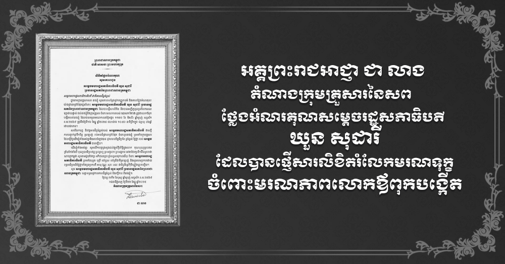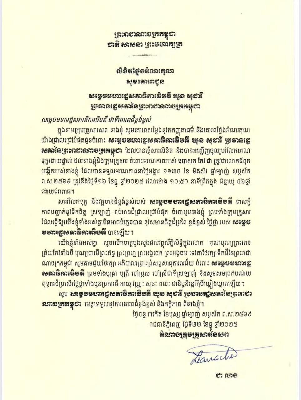 សាររំលែកទុក្ខ និងវត្តមានដ៏ខ្ពង់ខ្ពស់របស់ សម្តេចមហារដ្ឋសភាធិការធិបតី ជាសក្ខីភាពបញ្ជាក់នូវទឹកចិត្ត ស្រឡាញ់ រាប់អានដ៏ជ្រាលជ្រៅបំផុត ចំពោះរូបនាងខ្ញុំ ព្រមទាំងក្រុមគ្រួសារ ដែលធ្វើឱ្យយើងខ្ញុំទាំងអស់គ្នាមិនអាចបំភ្លេចបាន នូវសមានចិត្តដ៏ប្រពៃខ្ពង់ខ្ពស់ថ្លៃថ្លា របស់សម្តេចមហារដ្ឋសភាធិការធិបតីបានឡើយ។