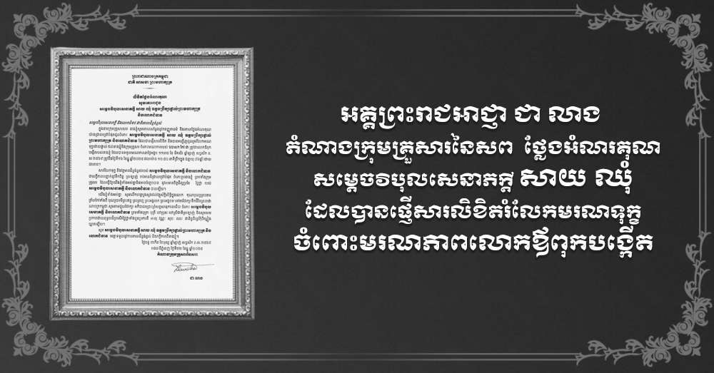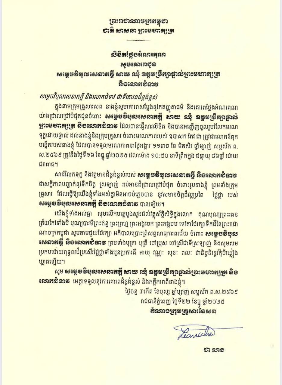 (ភ្នំពេញ)៖ អគ្គព្រះរាជអាជ្ញា ជា លាង តំណាងក្រុមគ្រួសារនៃសព បានចេញសារលិខិតថ្លែងអំណរគុណ សូមគោរពជូនសម្តេចវិបុលសេនាភក្តី សាយ ឈុំ ឧត្តមប្រឹក្សាផ្ទាល់ព្រះមហាក្សត្រ និងលោកស្រី ដែលបានផ្ញើសារលិខិត និងបានអញ្ជើញចូលរួមរំលែកមរណទុក្ខដោយផ្ទាល់ ដល់លោកស្រី និងក្រុមគ្រួសារ ចំពោះមរណភាពរបស់ ឧបាសក កែវ ជា ត្រូវជាលោកឪពុកបង្កើត កាលពីថ្ងៃទី១៦ ខែធ្នូ ឆ្នាំ២០២៥ វេលាម៉ោង១០៖៥០នាទីព្រឹក ក្នុងជន្មាយុ៨៦ឆ្នាំ ដោយជរាពាធ។