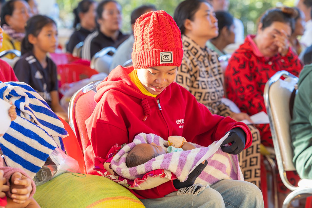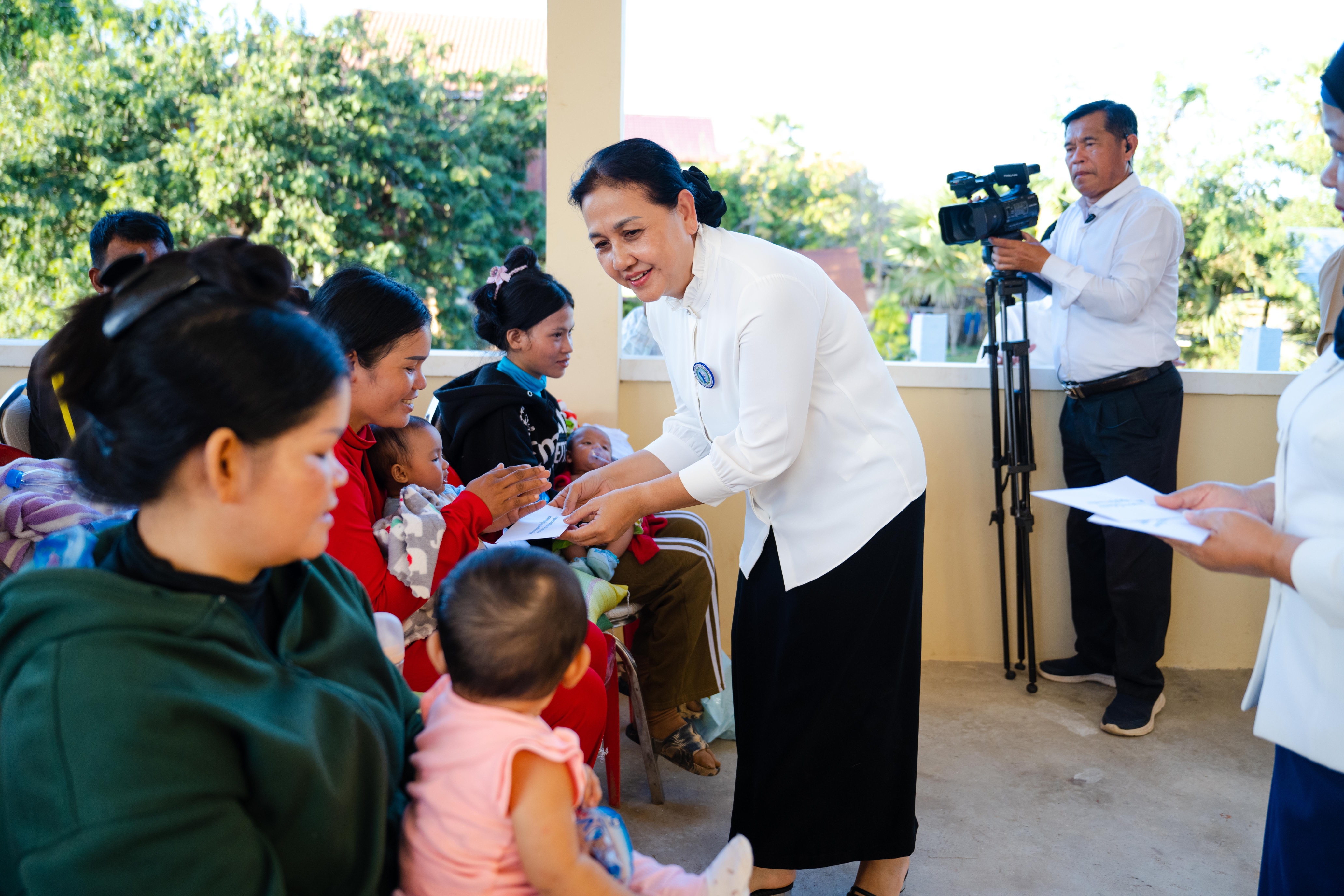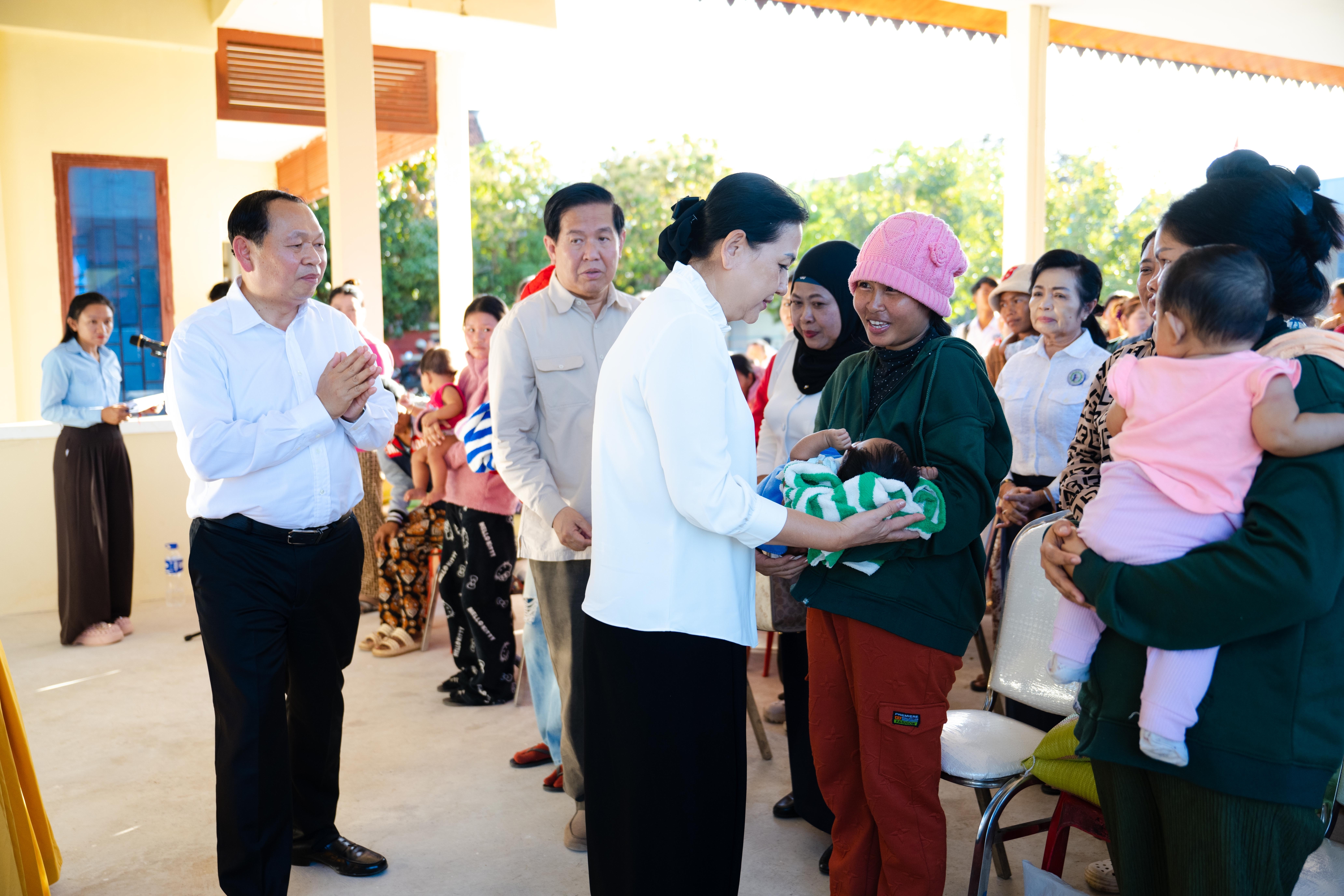 សូមជម្រាបជូនដែរថា ក្នុងពិធីសំណេះសំណាលនោះដែរ លោកប្រធាន និងលោកជំទាវ បាននាំយកគ្រឿងឧបភោគបរិភោគ រួមមាន៖ ១. អង្ករ, ២. ត្រីខ, ៣. សារ៉ុង, ៤. ក្រមា, ៥. សំឡីអនាម័យ, ៦. ទឹកត្រី, ៧. ទឹកស៊ីអ៊ីវ ព្រមទាំងថវិកាមួយចំនួន ដែលអំណោយដ៏ថ្លៃថ្លារបស់ សម្ដេចមហាបវរធិបតី ហ៊ុន ម៉ាណែត នាយករដ្ឋមន្ដ្រីនៃព្រះរាជាណាចក្រកម្ពុជា និងលោកស្រីបណ្ឌិត ពេជ ចន្ទមុន្នី ជូនដល់បងប្អូនប្រជាពលរដ្ឋទាំងអស់ផងដែរ។ ជាមួយគ្នានោះ លោកស្រីប្រធានកិត្តិយស លោកស្រីប្រធាន និងសមាជិកា នៃសមាគមនារីកម្ពុជាដើម្បីសន្តិភាពនិងអភិវឌ្ឍន៍ នៃក្រសួងអភិវឌ្ឍន៍ជនបន បានជូនថវិកាមួយចំនួនបន្ថែមទៀតដល់បងប្អូនស្ដ្រីដែលទើបសម្រាលកូនរួចចំនួន ៦នាក់ផងដែរ៕