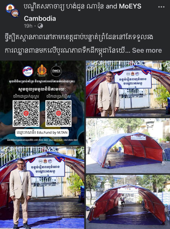 ក្រុមយុវជនស្ម័គ្រចិត្តដើម្បីការអប់រំ ដែលទទួលបានការគាំទ្រពីសំណាក់ ឯកឧត្តមបណ្ឌិតសភាចារ្យ ហង់ជួន ណារ៉ុន ឧបនាយករដ្ឋមន្ត្រី រដ្ឋមន្រ្តីក្រសួងអប់រំ យុវជន និងកីឡា សូមអំពាវនាវ សាធារណជនទាំងអស់ មេត្តាចូលរួមចំណែកក្នុងការកសាងធនធានប្រកបដោយសក្ដានុពល តាមរយៈការជួយឧបត្ថម្ភ «ថ្នាក់រៀនពហុបំណងបណ្ដោះអាសន្ន» ដើម្បីផ្ដល់បរិយាកាសសមប្រកបអនុញ្ញាតឱ្យសិស្សានុសិស្ស ជាពិសេសកុមារ បានបន្តការសិក្សារបស់ខ្លួនបានដោយរលូន។