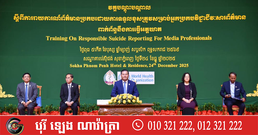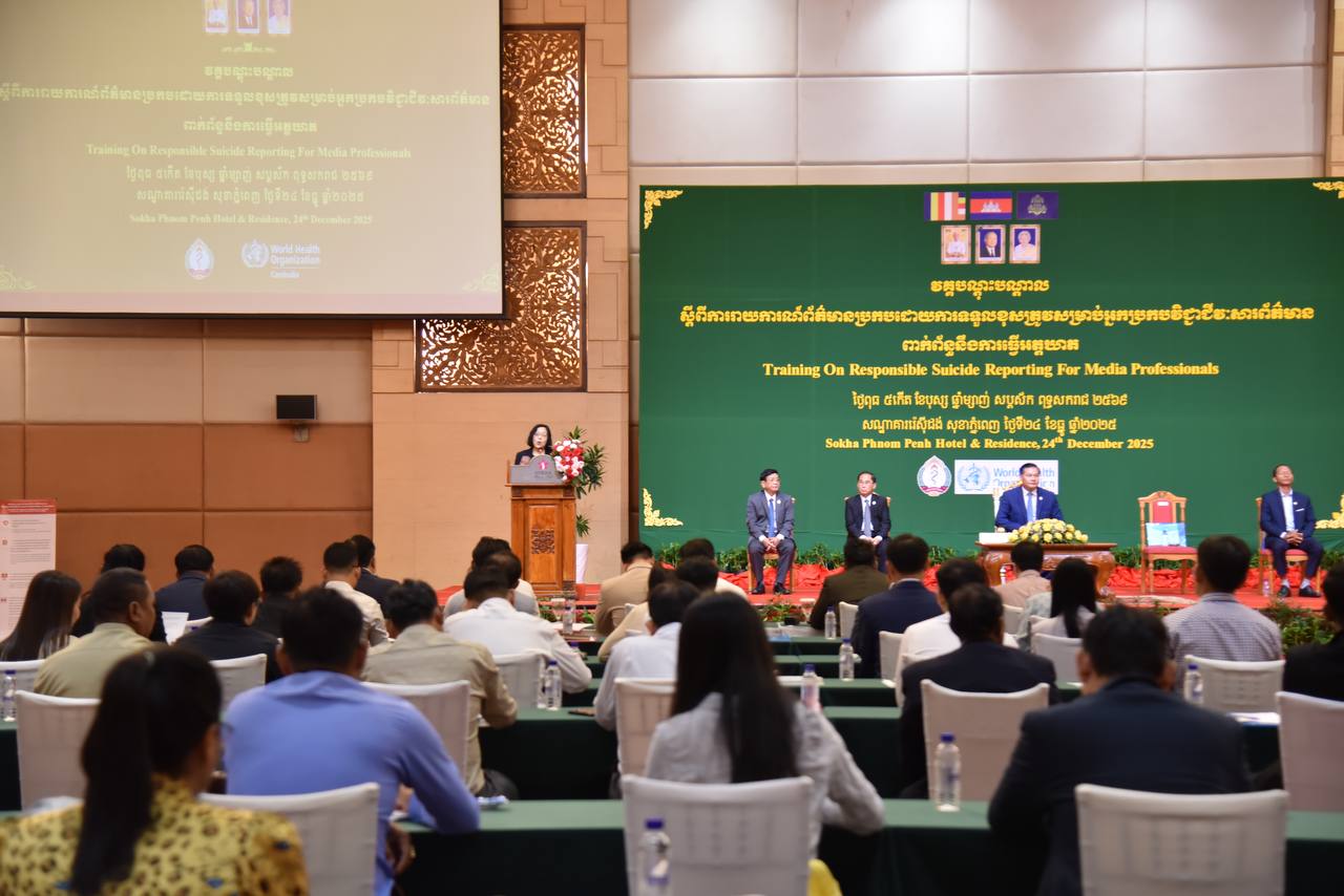 (ភ្នំពេញ)៖ ក្រសួងសុខាភិបាល នៅព្រឹកថ្ងៃទី២៤ ខែធ្នូ ឆ្នាំ២០២៥នេះ បានបើកវគ្គបណ្ដុះបណ្ដាល ស្ដីពីការរាយការណ៍ព័ត៌មាន ប្រកបដោយទទួលខុសត្រូវសម្រាប់អ្នកប្រកបវិជ្ជាជីវៈអ្នកសារព័ត៌មាន ពាក់ព័ន្ធនឹងការធ្វើអត្ដឃាត។ ពិធីនេះបានប្រព្រឹត្ដទៅក្រោមអធិបតីភាពលោកឱសថការី ឈី ហុង រដ្ឋលេខាធិការក្រសួងសុខាភិបាល តំណាងដ៏ខ្ពង់ខ្ពស់លោកសាស្ដ្រាចារ្យ ឈាង រ៉ា រដ្ឋមន្ដ្រីក្រសួងសុខាភិបាល។