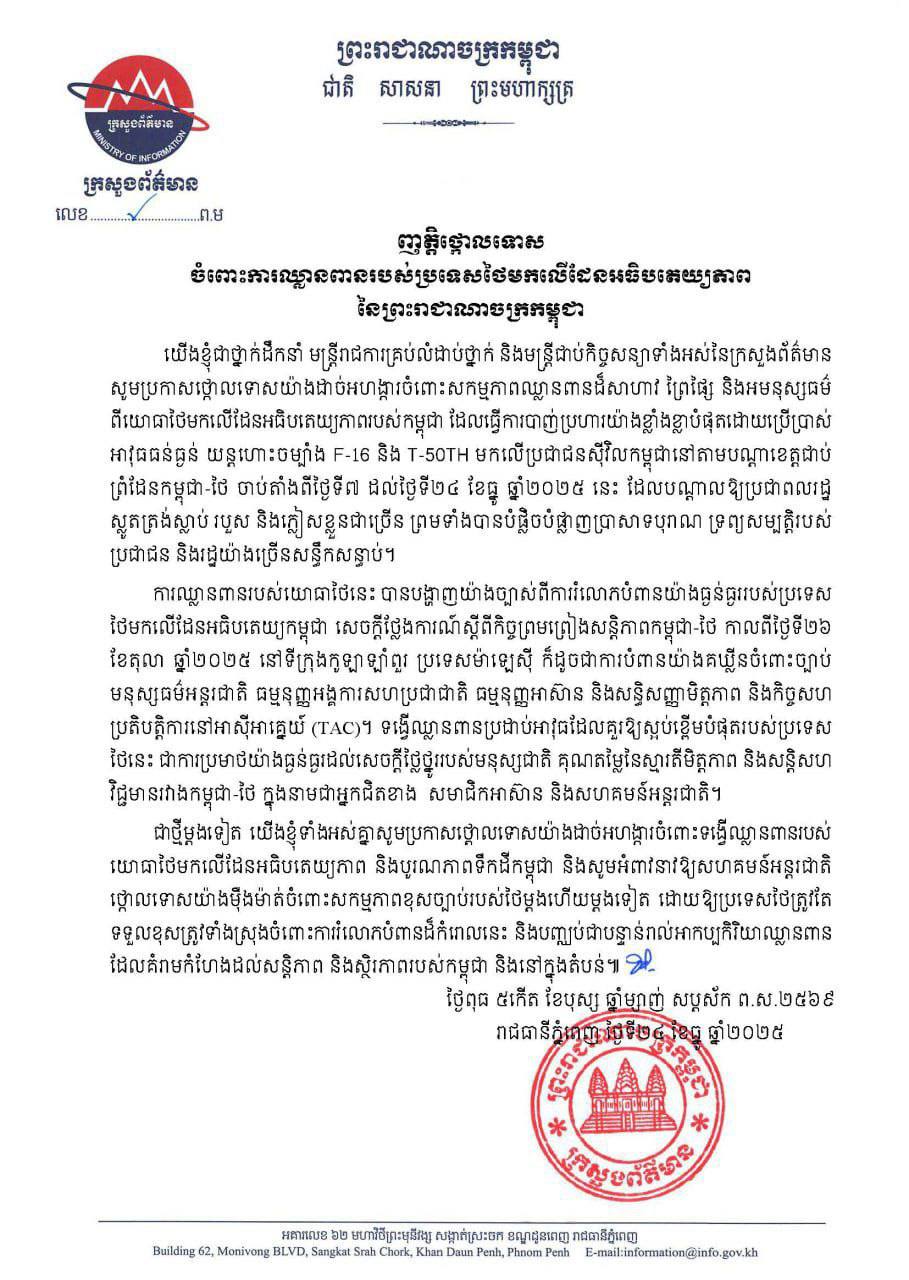 (ភ្នំពេញ)៖ ក្រសួងព័ត៌មាន និងមន្រ្តីក្រោមឱវាទទាំងអស់ សូមប្រកាសថ្កោលទោសយ៉ាងដាច់អហង្ការចំពោះទង្វើអមនុស្សធម៌ដ៏សាហាវយង់ឃ្នង របស់យោធាថៃ ដែលបានឈ្លានពានមកលើអធិបតេយ្យភាពនៃព្រះរាជាណាចក្រកម្ពុជា ជាពិសេសបានបន្តបាញ់ប្រហារមកលើប្រជាជនស៊ីវិលស្លូតត្រង់ នៅតាមបណ្តាខេត្តជាប់ព្រំដែនកម្ពុជា ថៃ ចាប់តាំងពីរសៀលថ្ងៃទី៧ ខែធ្នូ រហូតដល់ថ្ងៃទី២៤ ខែធ្នូ ឆ្នាំ២០២៥នេះ។