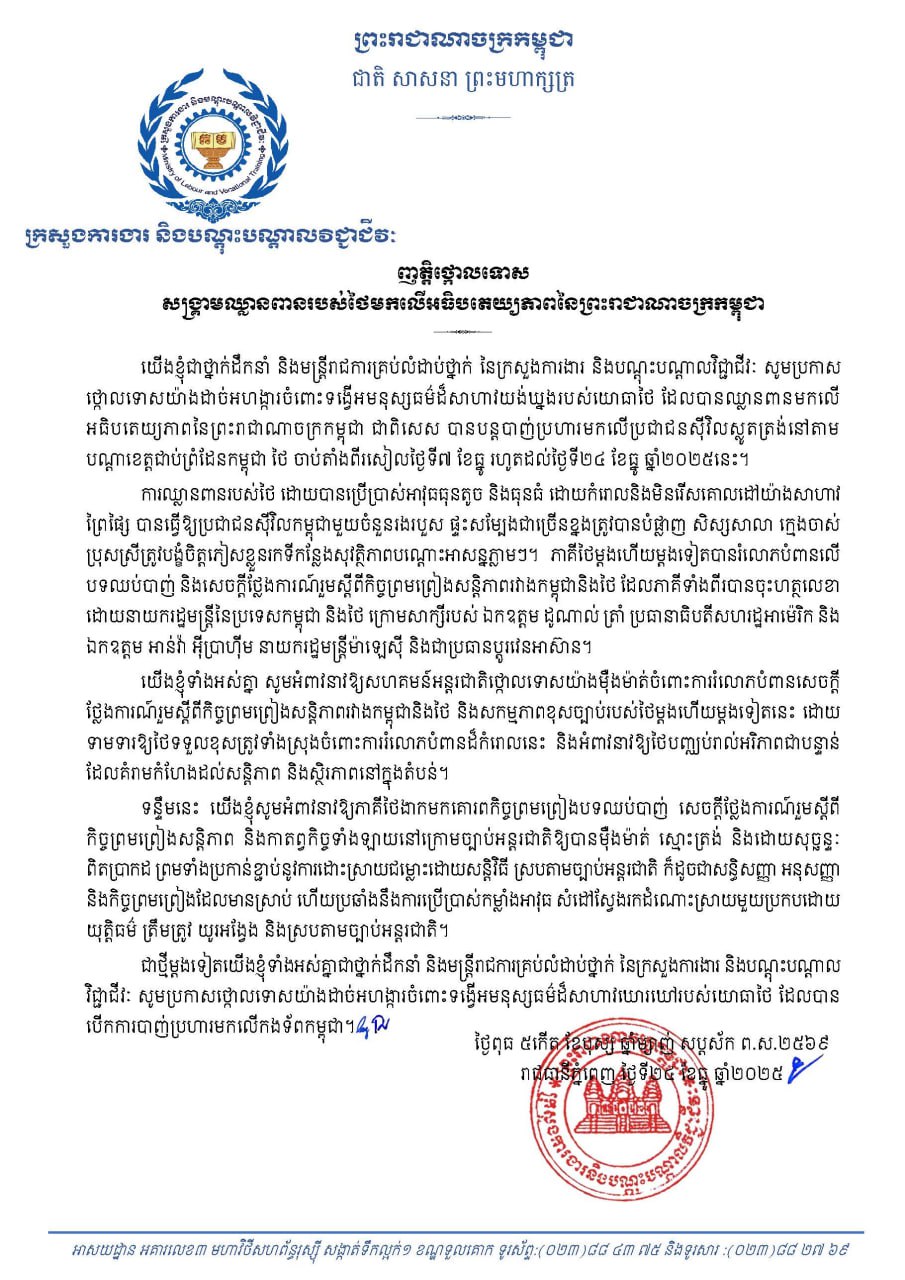 (ភ្នំពេញ)៖ ក្រសួងការងារ និងបណ្ដុះបណ្ដាលវិជ្ជាជីវៈ និងមន្រ្តីក្រោមឱវាទទាំងអស់ សូមប្រកាសថ្កោលទោសយ៉ាងដាច់អហង្ការចំពោះទង្វើអមនុស្សធម៌ដ៏សាហាវយង់ឃ្នង របស់យោធាថៃ ដែលបានឈ្លានពានមកលើអធិបតេយ្យភាពនៃព្រះរាជាណាចក្រកម្ពុជា ជាពិសេសបានបន្តបាញ់ប្រហារមកលើប្រជាជនស៊ីវិលស្លូតត្រង់ នៅតាមបណ្តាខេត្តជាប់ព្រំដែនកម្ពុជា ថៃ ចាប់តាំងពីរសៀលថ្ងៃទី៧ ខែធ្នូ រហូតដល់ថ្ងៃទី២៤ ខែធ្នូ ឆ្នាំ២០២៥នេះ។