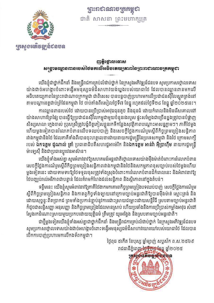 ទន្ទឹមនេះ យើងខ្ញុំសូមអំពាវនាវឱ្យភាគីថៃងាកមកគោរពកិច្ចព្រមព្រៀងបទឈប់បាញ់ សេចក្ដីថ្លែងការណ៍រួមស្តីពីកិច្ចព្រមព្រៀងសន្តិភាព និងកាតព្វកិច្ចទាំងឡាយនៅក្រោមច្បាប់អន្ដរជាតិឱ្យបានម៉ឺងម៉ាត់ ស្មោះត្រង់ និងដោយសុច្ឆន្ទៈពិតប្រាកដ ព្រមទាំងប្រកាន់ខ្ជាប់នូវការដោះស្រាយ ជម្លោះដោយសន្តិវិធី ស្របតាមច្បាប់អន្ដរជាតិ ក៏ដូចជាសន្ធិសញ្ញា អនុសញ្ញា និងកិច្ចព្រមព្រៀងដែលមានស្រាប់ ហើយប្រឆាំងនឹងការប្រើប្រាស់កម្លាំងអាវុធ សំដៅស្វែងរកដំណោះស្រាយមួយប្រកបដោយយុត្តិធម៌ ត្រឹមត្រូវ យូរអង្វែង និងស្របតាមច្បាប់អន្តរជាតិ។