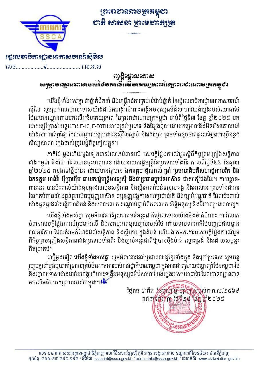 រដ្ឋលេខាធិការដ្ឋានអាកាសចរណ៍ស៊ីវិល ប្រកាសចេញញត្តិថ្កោលទោស សង្គ្រាមឈ្លានពានរបស់ថៃមកលើអធិបតេយ្យភាព នៃព្រះរាជាណាចក្រកម្ពុជា