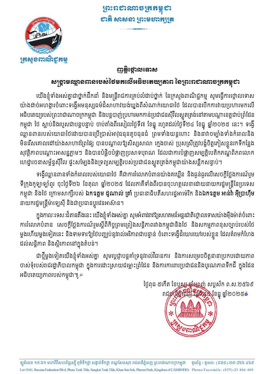 ក្រសួងពាណិជ្ជកម្ម ប្រកាសចេញត្តិថ្កោលទោស សង្គ្រាមឈ្លានពានរបស់ថៃមកលើអធិបតេយ្យភាព នៃព្រះរាជាណាចក្រកម្ពុជា