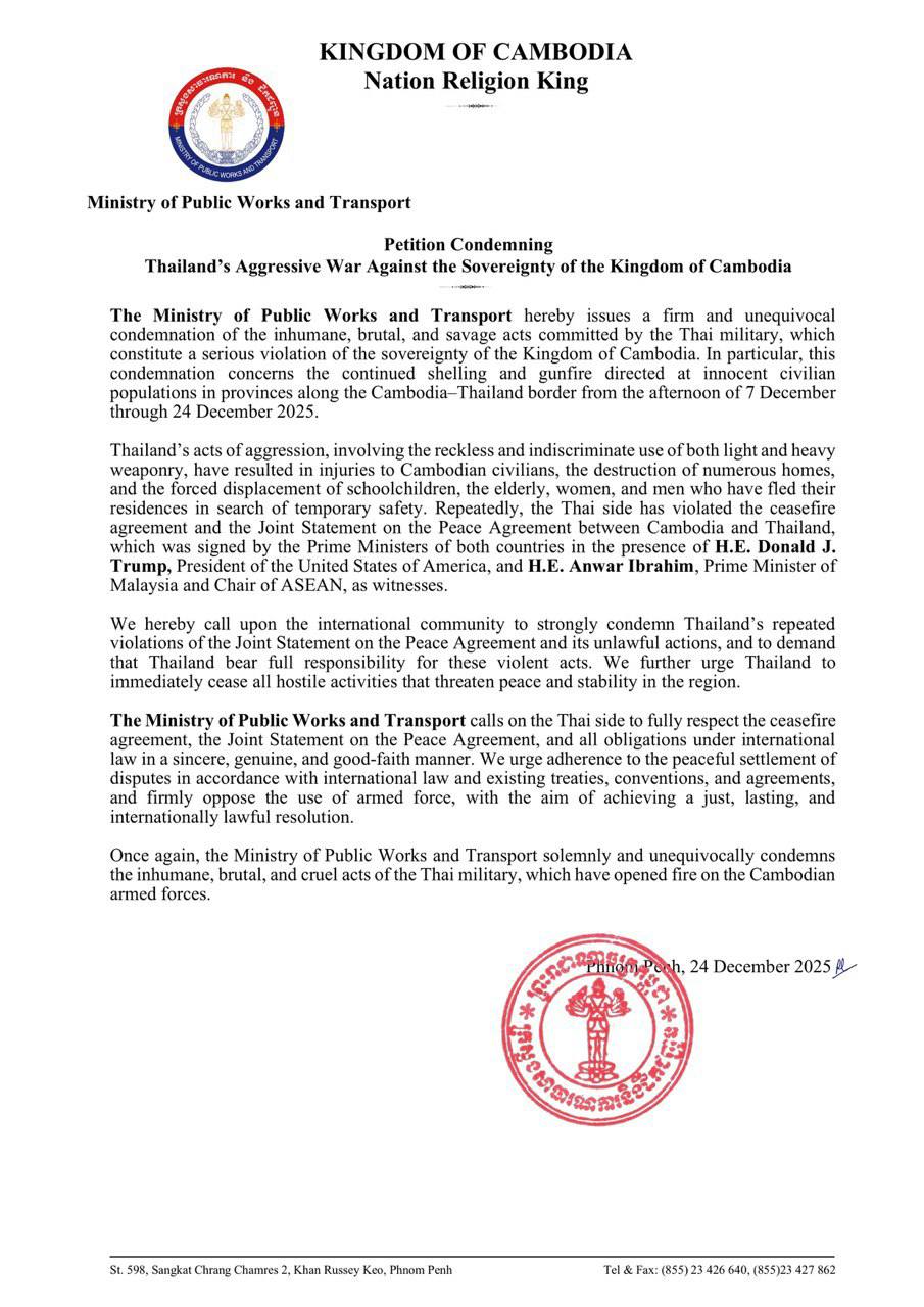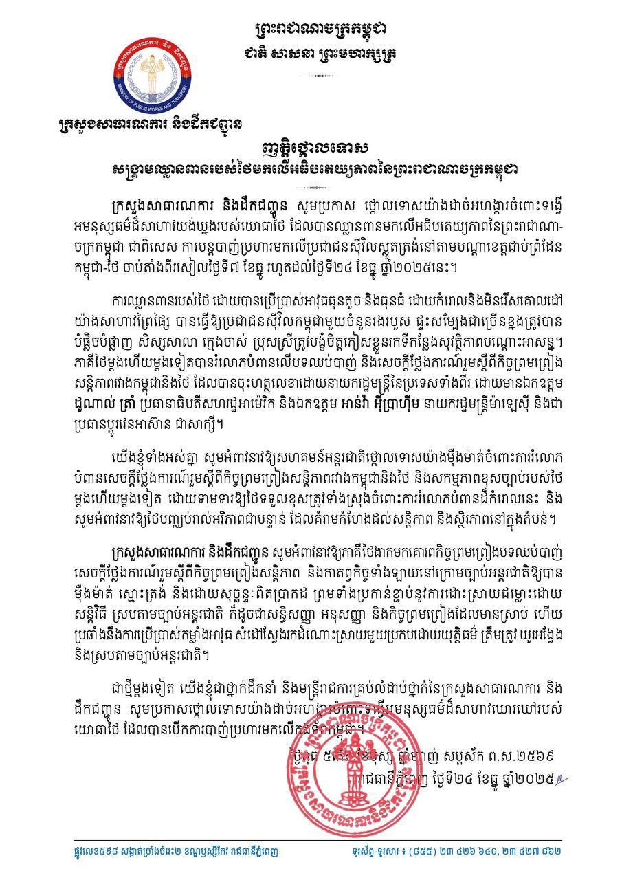 (ភ្នំពេញ)៖ ក្រសួងសាធារណការ និងដឹកជញ្ជូន សូមប្រកាសថ្កោលទោសយ៉ាងដាច់អហង្ការចំពោះទង្វើអមនុស្សធម៌ដ៏សាហាវយង់ឃ្នង របស់យោធាថៃ ដែលបានឈ្លានពានមកលើអធិបតេយ្យភាពនៃព្រះរាជាណាចក្រកម្ពុជា ជាពិសេសបានបន្តបាញ់ប្រហារមកលើប្រជាជនស៊ីវិលស្លូតត្រង់ នៅតាមបណ្តាខេត្តជាប់ព្រំដែនកម្ពុជា ថៃ ចាប់តាំងពីរសៀលថ្ងៃទី៧ ខែធ្នូ រហូតដល់ថ្ងៃទី២៤ ខែធ្នូ ឆ្នាំ២០២៥នេះ។