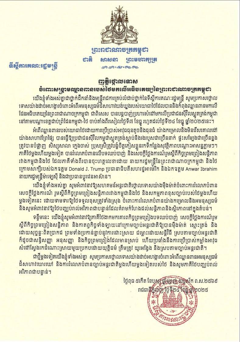 ការឈ្លានពានរបស់ថៃ ដោយបានប្រើប្រាស់អាវុធធុនតូច និងធុនធំ ដោយកំរោលនិងមិនរើសគោលដៅយ៉ាងសាហាវព្រៃផ្សៃ បានធ្វើឱ្យប្រជាជនស៊ីវិលកម្ពុជា មួយចំនួនរងរបួស ផ្ទះសម្បែងជាច្រើនខ្នងត្រូវបានបំផ្លាញ សិស្សសាលា ក្មេងចាស់ ប្រុសស្រីត្រូវបង្ខំចិត្តភៀសខ្លួនរកទីកន្លែងសុវត្ថិភាពបណ្តោះអាសន្នភ្លាមៗ។ ភាគីថៃម្តងហើយម្តងទៀត បានរំលោភបំពានលើបទឈប់បាញ់ និងសេចក្តីថ្លែងការណ៍រួមស្ដីពីកិច្ចព្រមព្រៀងសន្តិភាពរវាងកម្ពុជានិងថៃ ដែលភាគីទាំងពីរបានចុះហត្ថលេខាដោយ នាយករដ្ឋមន្ត្រីនៃប្រទេសកម្ពុជា និងថៃ ក្រោមសាក្សីរបស់ ឯកឧត្តម ដូណាល់ ត្រាំ ប្រធានាធិបតីសហរដ្ឋអាម៉េរិក និងឯកឧត្តម អាន់វ៉ា អ៉ីប្រាហ៊ីម នាយករដ្ឋមន្ត្រីម៉ាឡេស៊ី និងជាប្រធានប្តូរវេនអាស៊ាន។