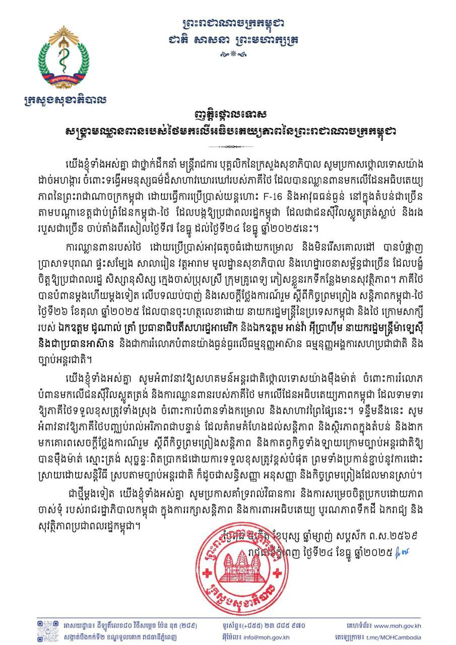 (ភ្នំពេញ)៖ ក្រសួងសុខាភិបាល សូមប្រកាសថ្កោលទោសយ៉ាងដាច់អហង្ការចំពោះទង្វើអមនុស្សធម៌ដ៏សាហាវយង់ឃ្នង របស់យោធាថៃ ដែលបានឈ្លានពានមកលើអធិបតេយ្យភាពនៃព្រះរាជាណាចក្រកម្ពុជា ជាពិសេសបានបន្តបាញ់ប្រហារមកលើប្រជាជនស៊ីវិលស្លូតត្រង់ នៅតាមបណ្តាខេត្តជាប់ព្រំដែនកម្ពុជា ថៃ ចាប់តាំងពីរសៀលថ្ងៃទី៧ ខែធ្នូ រហូតដល់ថ្ងៃទី២៤ ខែធ្នូ ឆ្នាំ២០២៥នេះ។
