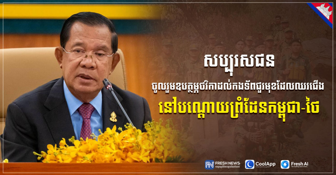 សម្តេចតេជោ ហ៊ុន សែន ថ្លែងអំពាវនាវប្រជាពលរដ្ឋទាំងអស់ ឱ្យចូលរួមឧបត្ថម្ភតាមការស្ម័គ្រចិត្តដល់កងទ័ព ដើម្បីបង្ហាញពីភាពរួបរួមគ្នា ជាធ្លង់មួយនៃខឿនការពារជាតិរបស់កម្ពុជា។