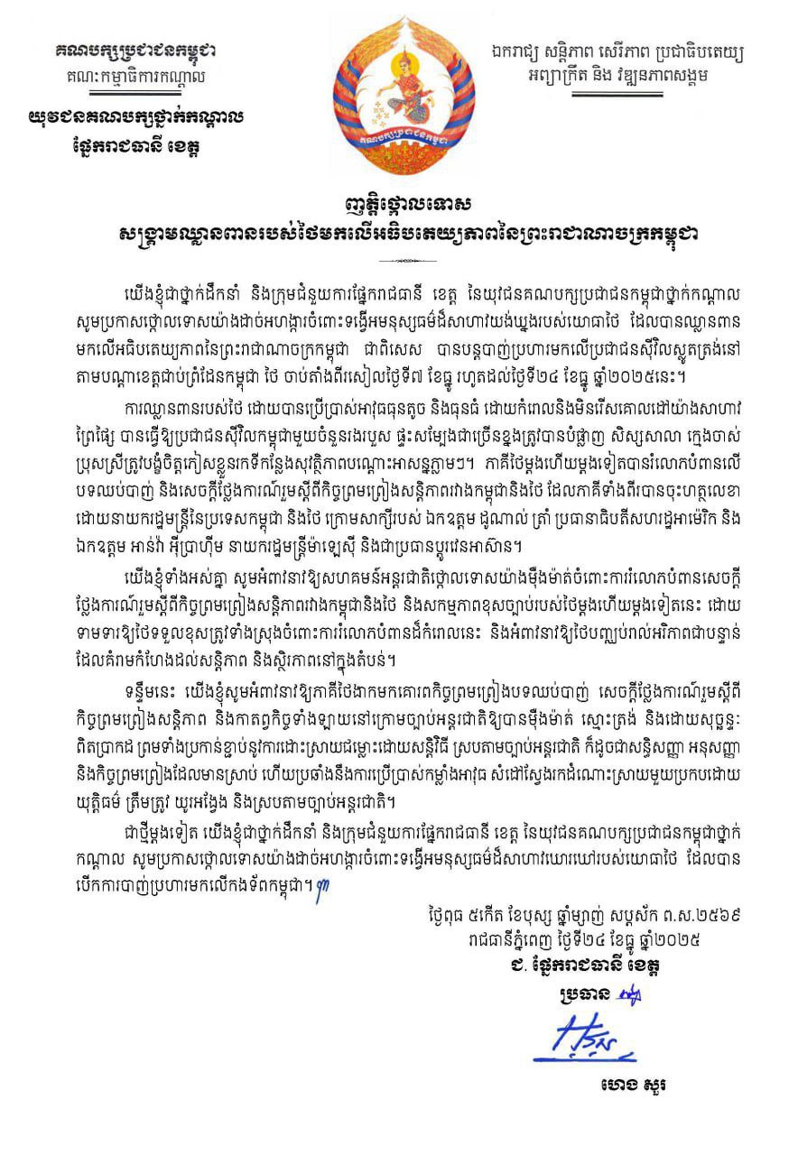 (ភ្នំពេញ)៖ ថ្នាក់ដឹកនាំ និងក្រុមជំនួយការផ្នែករាជធានី-ខេត្ត នៃយុវជនគណបក្សប្រជាជនកម្ពុជាថ្នាក់កណ្តាល នៅថ្ងៃទី២៤ ខែធ្នូ ឆ្នាំ២០២៥ បានចេញញត្តិថ្កោលទោសយ៉ាងដាច់អហង្ការចំពោះទង្វើអមនុស្សធម៌ដ៏សាហាវយង់ឃ្នងរបស់យោធាថៃ ដែលបានឈ្លានពានមកលើ អធិបតេយ្យភាពនៃព្រះរាជាណាចក្រកម្ពុជា ជាពិសេស បានបន្តបាញ់ប្រហារមកលើប្រជាជនស៊ីវិលស្លូតត្រង់នៅតាម បណ្តាខេត្តជាប់ព្រំដែនកម្ពុជា ថៃ ចាប់តាំងពីរសៀលថ្ងៃទី៧ ខែធ្នូ រហូតដល់ថ្ងៃទី២៤ ខែធ្នូ ឆ្នាំ២០២៥នេះ។