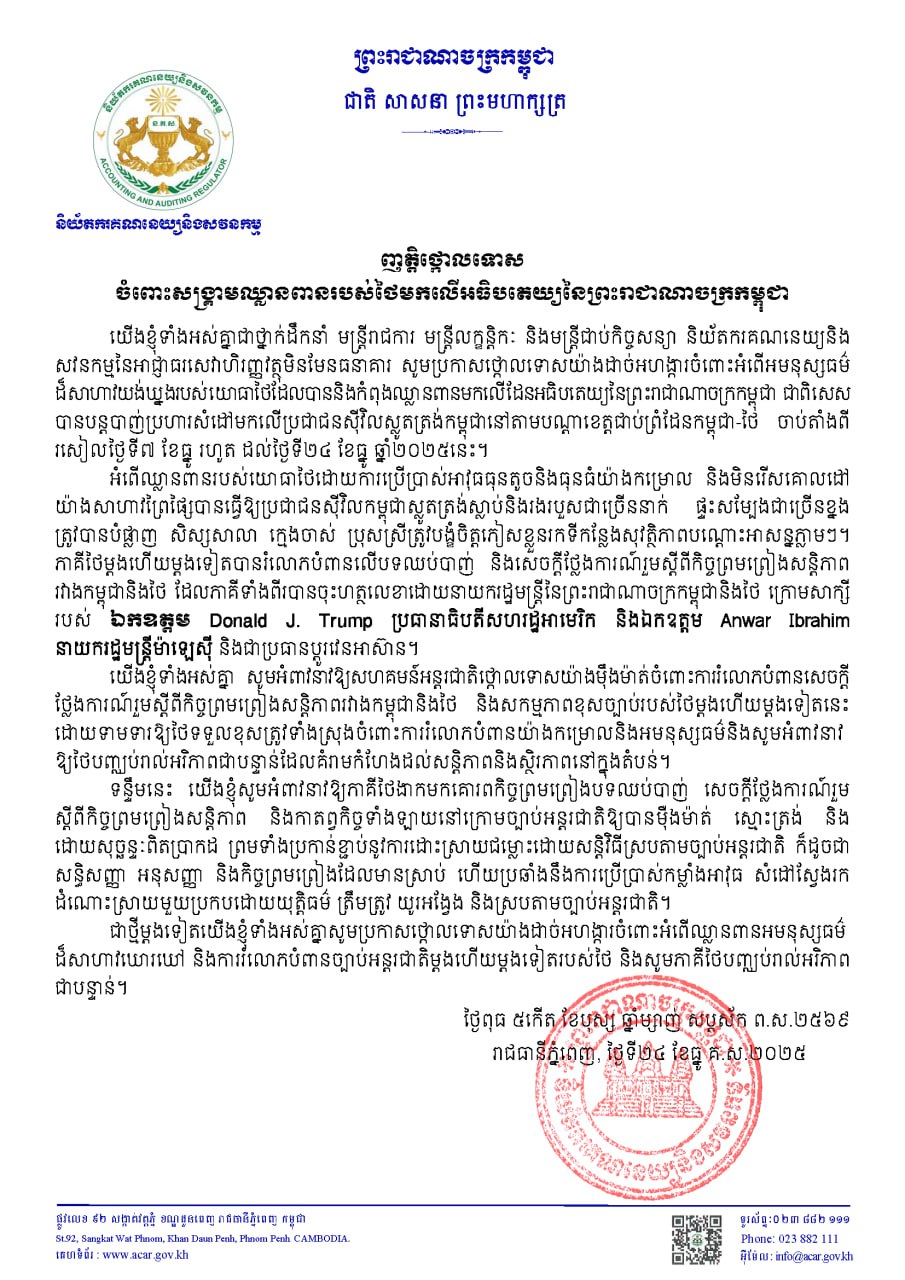 ការឈ្លានពានរបស់ថៃ ដោយបានប្រើប្រាស់អាវុធធុនតូច និងធុនធំ ដោយកំរោលនិងមិនរើសគោលដៅយ៉ាងសាហាវព្រៃផ្សៃ បានធ្វើឱ្យប្រជាជនស៊ីវិលកម្ពុជា មួយចំនួនរងរបួស ផ្ទះសម្បែងជាច្រើនខ្នងត្រូវបានបំផ្លាញ សិស្សសាលា ក្មេងចាស់ ប្រុសស្រីត្រូវបង្ខំចិត្តភៀសខ្លួនរកទីកន្លែងសុវត្ថិភាពបណ្តោះអាសន្នភ្លាមៗ។ ភាគីថៃម្តងហើយម្តងទៀត បានរំលោភបំពានលើបទឈប់បាញ់ និងសេចក្តីថ្លែងការណ៍រួមស្ដីពីកិច្ចព្រមព្រៀងសន្តិភាពរវាងកម្ពុជានិងថៃ ដែលភាគីទាំងពីរបានចុះហត្ថលេខាដោយ នាយករដ្ឋមន្ត្រីនៃប្រទេសកម្ពុជា និងថៃ ក្រោមសាក្សីរបស់ ឯកឧត្តម ដូណាល់ ត្រាំ ប្រធានាធិបតីសហរដ្ឋអាម៉េរិក និងឯកឧត្តម អាន់វ៉ា អ៊ីប្រាហ៊ីម នាយករដ្ឋមន្ត្រីម៉ាឡេស៊ី និងជាប្រធានប្តូរវេនអាស៊ាន។