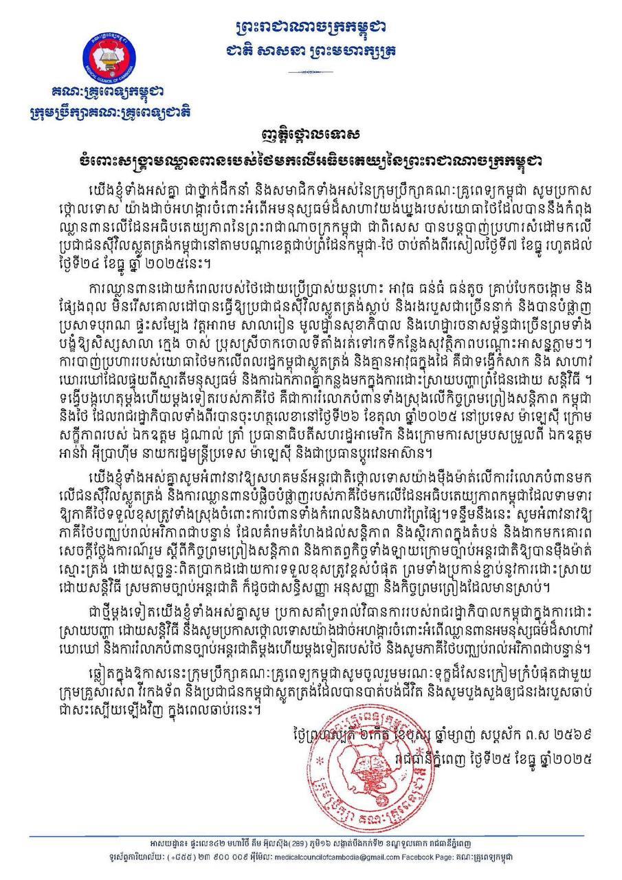 (ភ្នំពេញ)៖ គណៈគ្រូពេទ្យកម្ពុជា សូមប្រកាសថ្កោលទោសយ៉ាងដាច់អហង្ការចំពោះទង្វើអមនុស្សធម៌ដ៏សាហាវយង់ឃ្នង របស់យោធាថៃ ដែលបានឈ្លានពានមកលើអធិបតេយ្យភាពនៃព្រះរាជាណាចក្រកម្ពុជា ជាពិសេសបានបន្តបាញ់ប្រហារមកលើប្រជាជនស៊ីវិលស្លូតត្រង់ នៅតាមបណ្តាខេត្តជាប់ព្រំដែនកម្ពុជា ថៃ ចាប់តាំងពីរសៀលថ្ងៃទី៧ ខែធ្នូ រហូតដល់ថ្ងៃទី២៤ ខែធ្នូ ឆ្នាំ២០២៥នេះ។