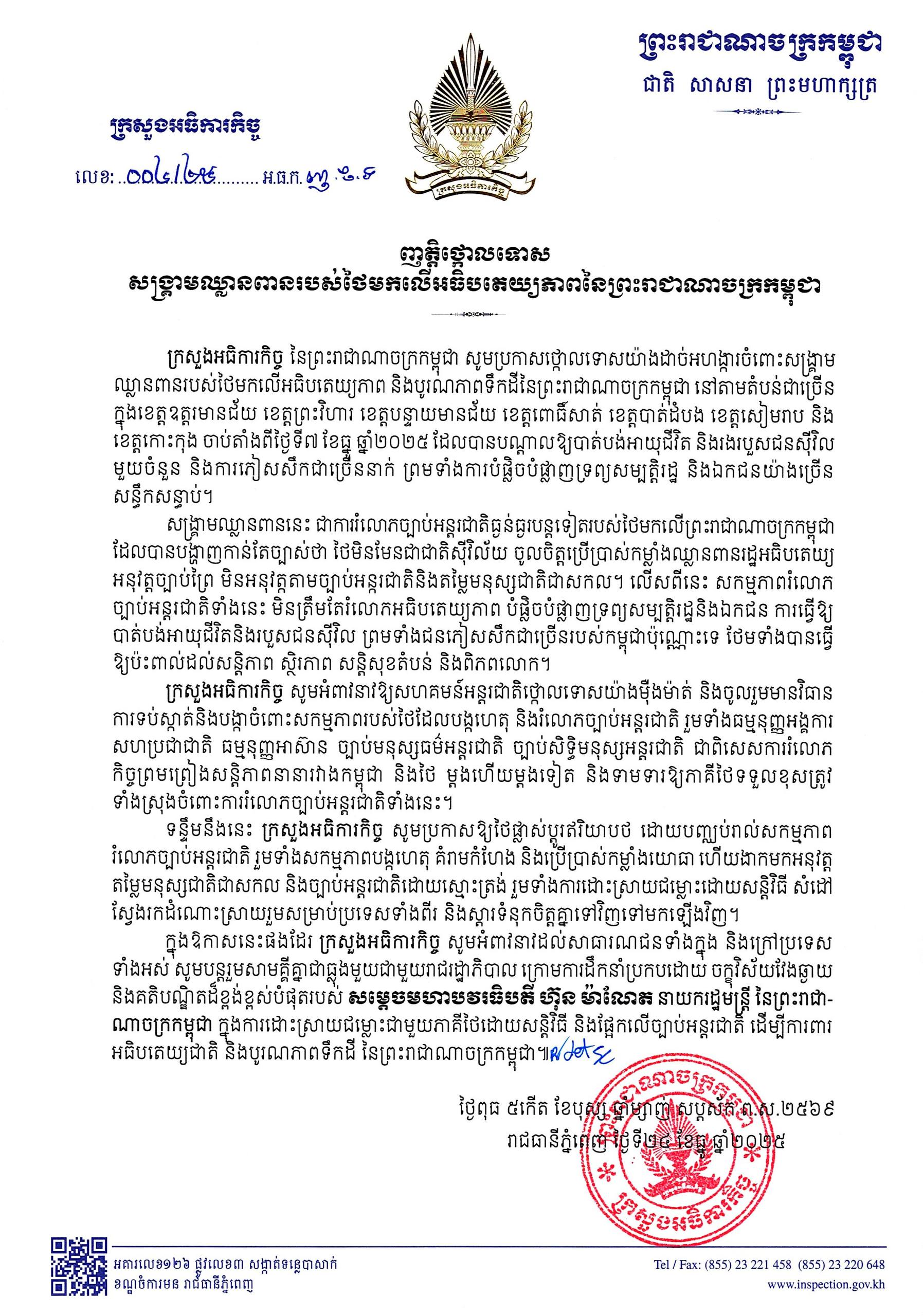 (ភ្នំពេញ)៖ ក្រសួងអធិការកិច្ច សូមប្រកាសថ្កោលទោសយ៉ាងដាច់អហង្ការចំពោះទង្វើអមនុស្សធម៌ដ៏សាហាវយង់ឃ្នង របស់យោធាថៃ ដែលបានឈ្លានពានមកលើអធិបតេយ្យភាពនៃព្រះរាជាណាចក្រកម្ពុជា ជាពិសេសបានបន្តបាញ់ប្រហារមកលើប្រជាជនស៊ីវិលស្លូតត្រង់ នៅតាមបណ្តាខេត្តជាប់ព្រំដែនកម្ពុជា ថៃ ចាប់តាំងពីរសៀលថ្ងៃទី៧ ខែធ្នូ រហូតដល់ថ្ងៃទី២៤ ខែធ្នូ ឆ្នាំ២០២៥។