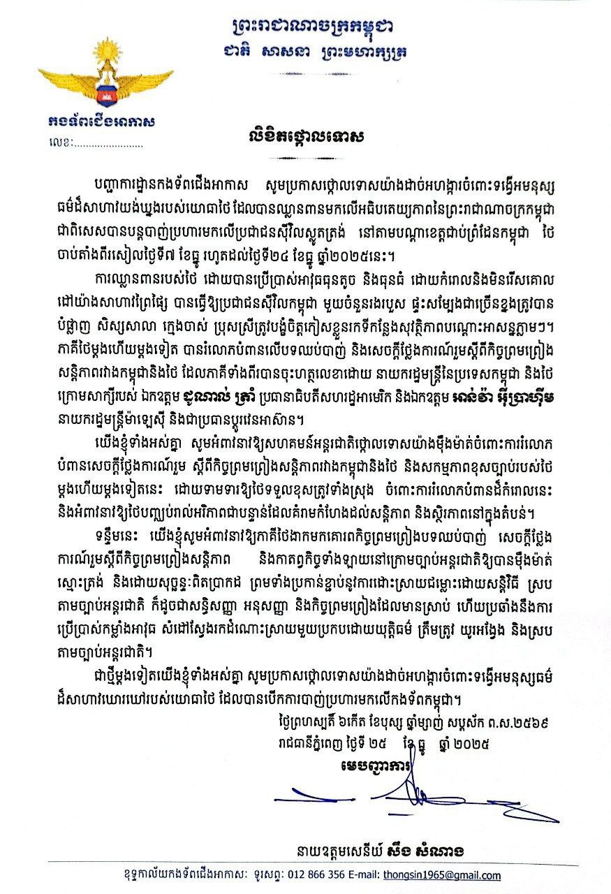 (ភ្នំពេញ)៖ បញ្ជាការដ្ឋានកងទ័ពជើងអាកាស សូមប្រកាសថ្កោលទោសយ៉ាងដាច់អហង្ការចំពោះទង្វើអមនុស្សធម៌ដ៏សាហាវយង់ឃ្នង របស់យោធាថៃ ដែលបានឈ្លានពានមកលើអធិបតេយ្យភាពនៃព្រះរាជាណាចក្រកម្ពុជា ជាពិសេសបានបន្តបាញ់ប្រហារមកលើប្រជាជនស៊ីវិលស្លូតត្រង់ នៅតាមបណ្តាខេត្តជាប់ព្រំដែនកម្ពុជា ថៃ ចាប់តាំងពីរសៀលថ្ងៃទី៧ ខែធ្នូ រហូតដល់ថ្ងៃទី២៤ ខែធ្នូ ឆ្នាំ២០២៥។