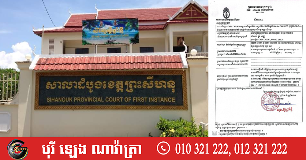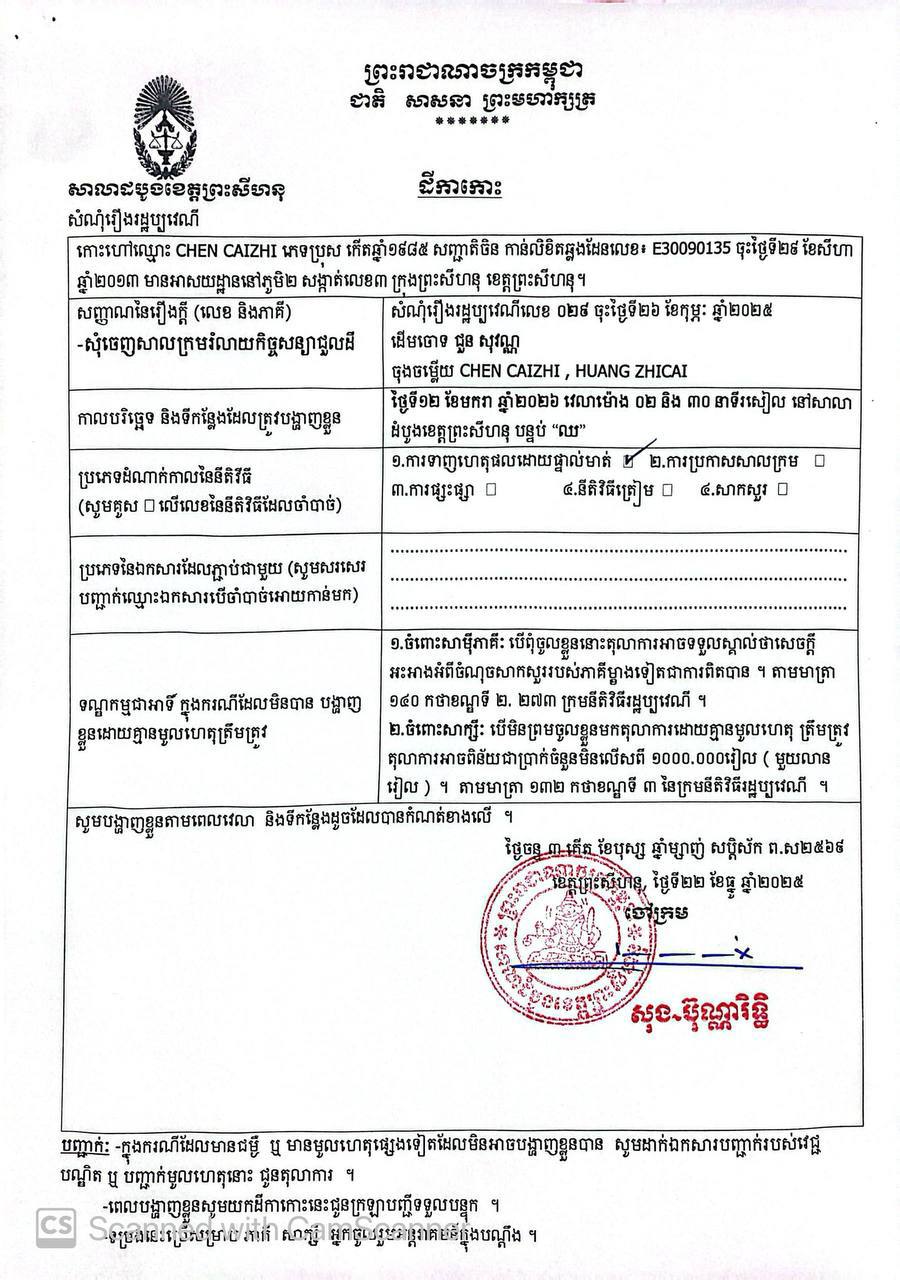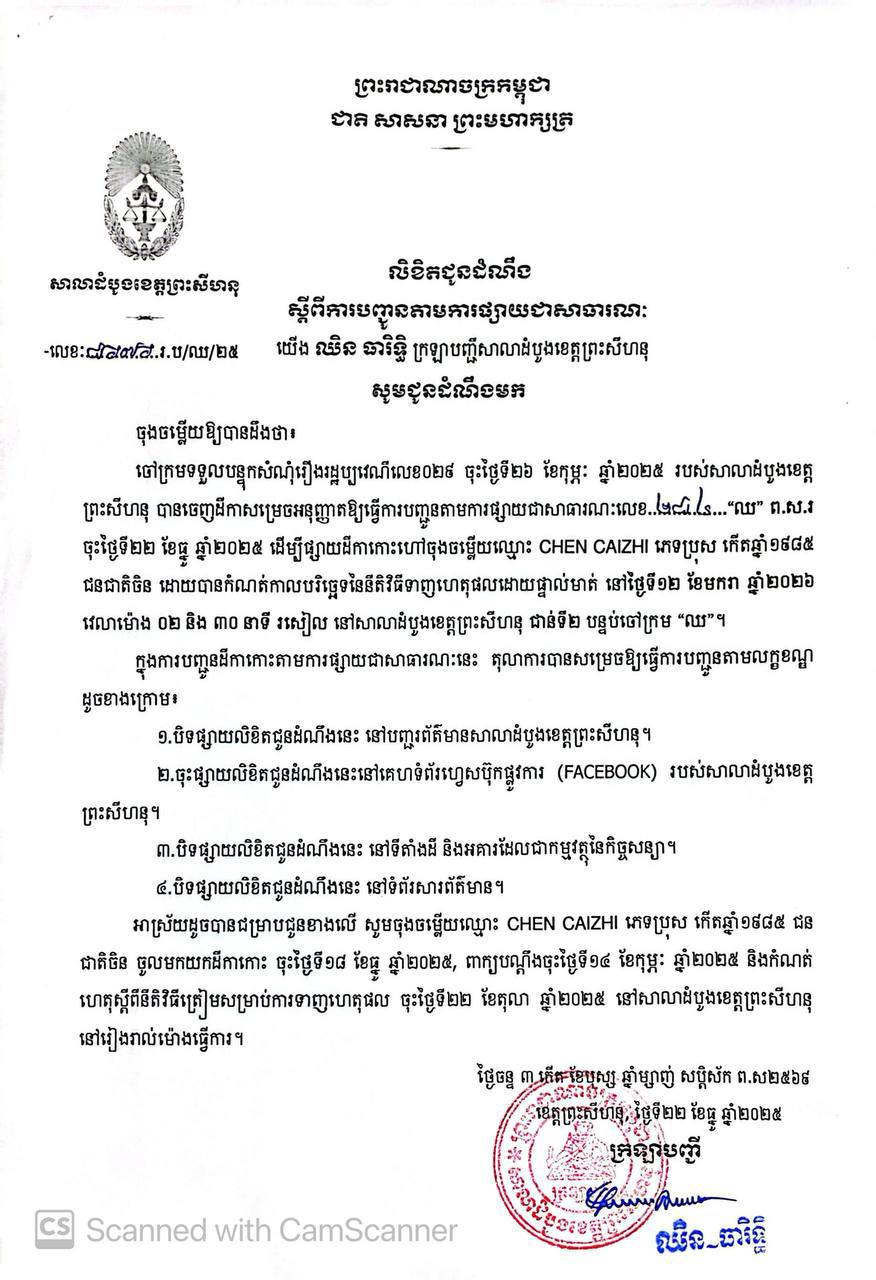 សាលាដំបូងខេត្តព្រះសីហនុ ចេញផ្សាយដីកាកោះហៅ ចុងចម្លើយឈ្មោះ CHEN CAIZHI និងកំណត់កាលបរិច្ឆេទ នៅថ្ងៃទី១២ ខែមករា ឆ្នាំ២០២៦